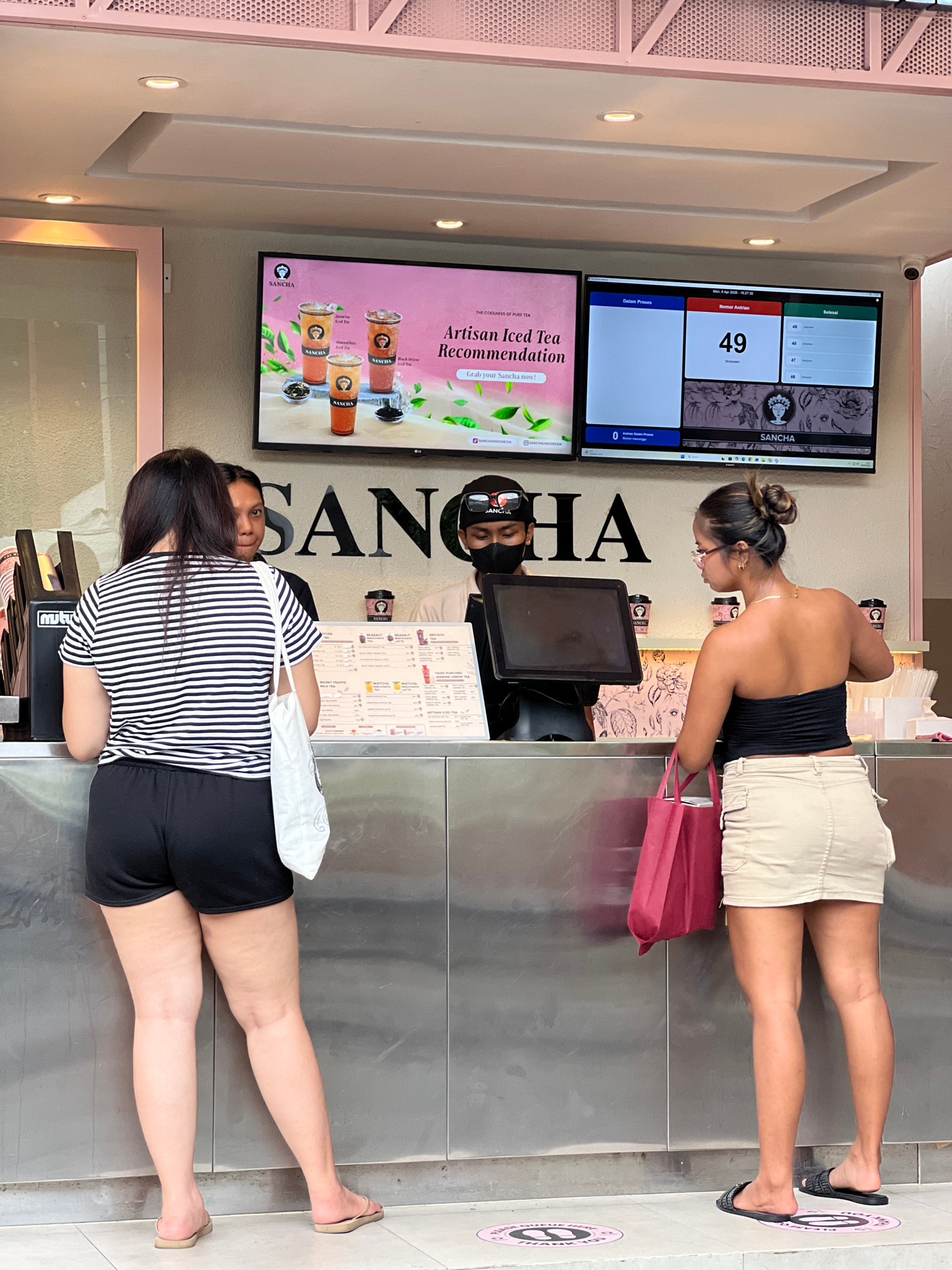 The image shows the interior of a Sancha tea shop, possibly located in Kuta, Indonesia, based on signage and the menu offering. Two female customers are standing at the counter; one in a black straple…read more