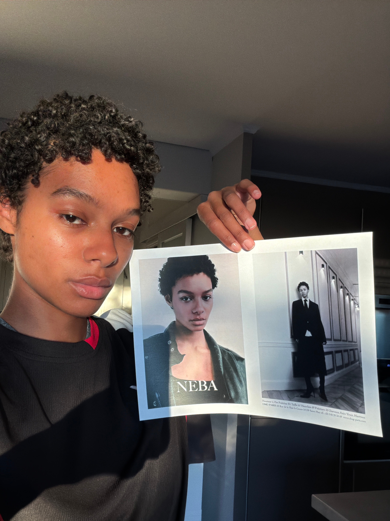 A person with dark skin and curly black hair is holding a magazine open in their right hand. The magazine shows two images. The top image is a black and white photograph of a person wearing a black su…read more