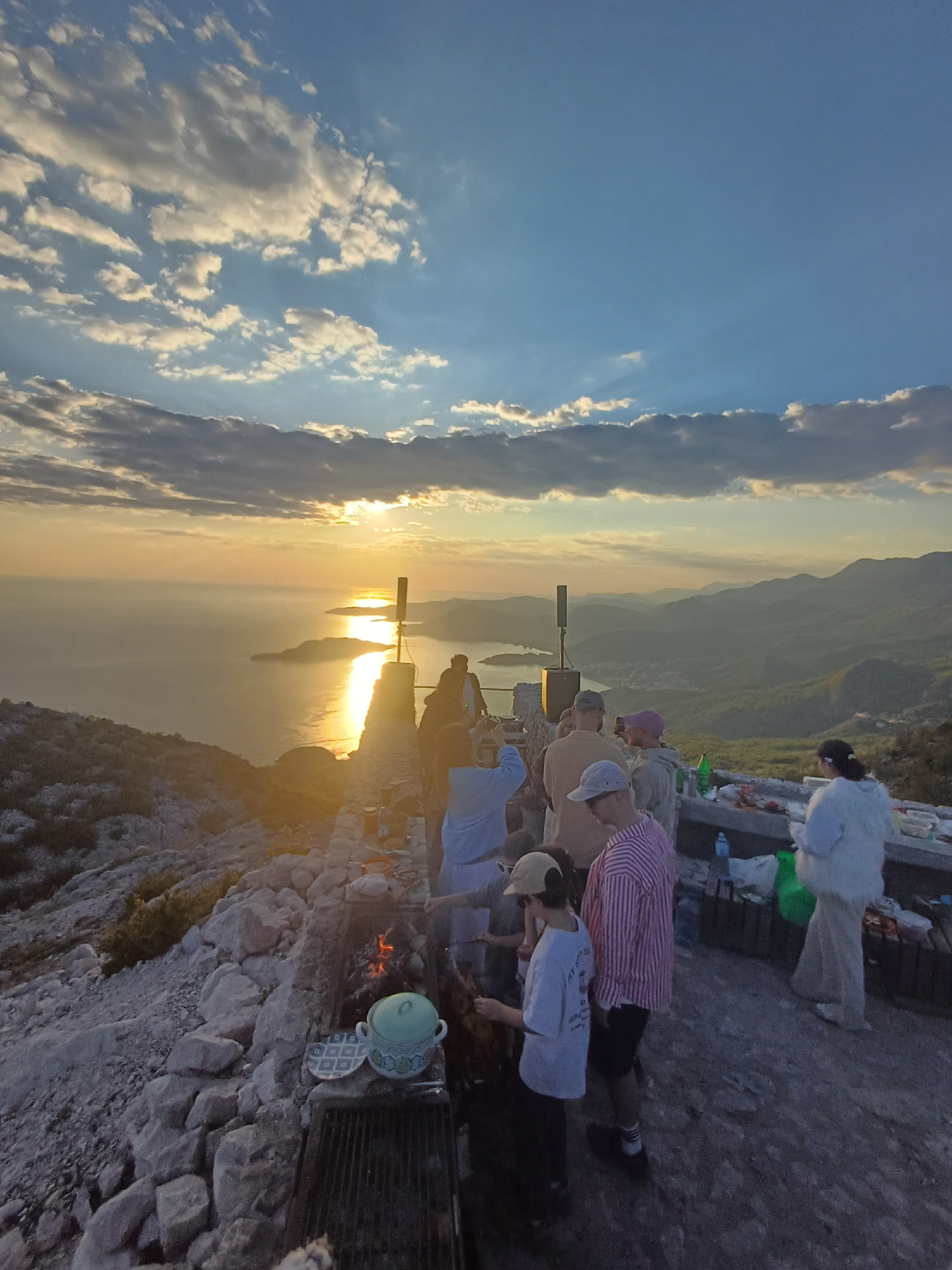 A gathering of people is observed on a rocky terrain, appearing to be at an elevated vantage point. In the background, a sunset illuminates the sky with a blend of orange and golden hues, highlighting…read more