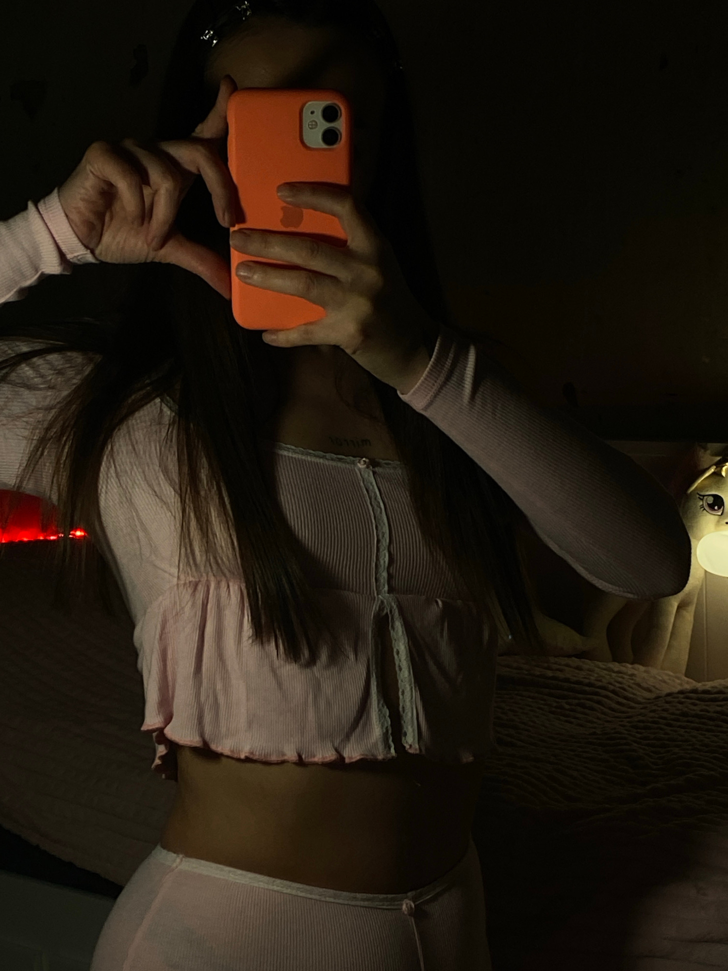 A woman is lying on her side in a dimly lit room, holding an orange mobile phone in front of her face, presumably taking a selfie. She is wearing a pink, long-sleeved top and matching bottoms. Some of…read more