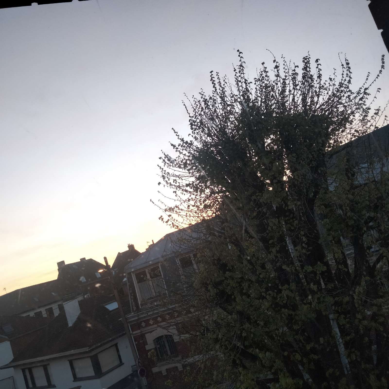 The image shows a view from a window in Lannoy, France, overlooking a residential area during sunset. The sky is light with a gradient of colors from orange near the horizon to pale blue above. Buildi…read more