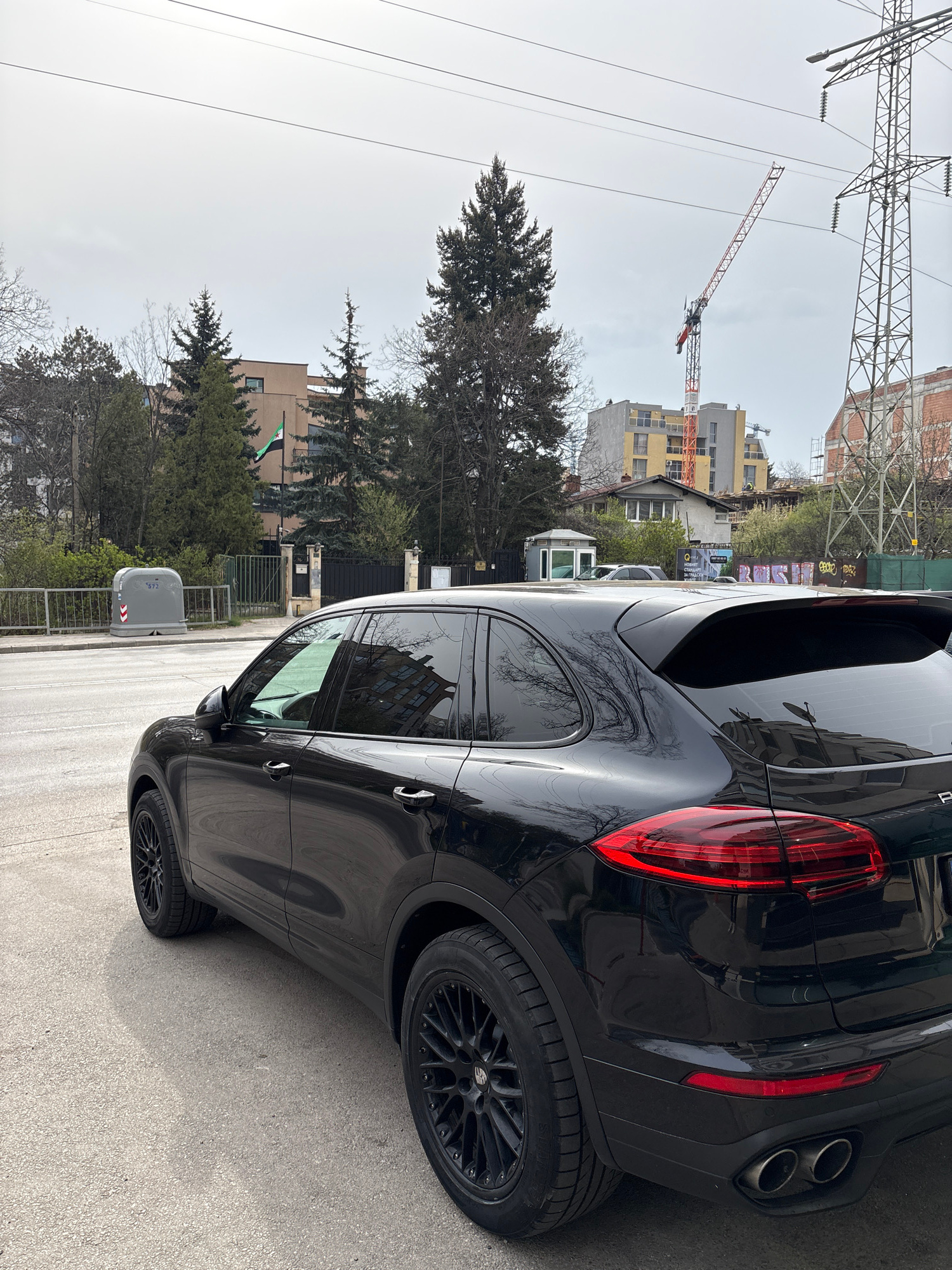 The image depicts a black SUV parked on a street in Sofia, Bulgaria. In the background are residential buildings, trees, power lines, a crane, and a building under construction. A Palestinian flag is…read more