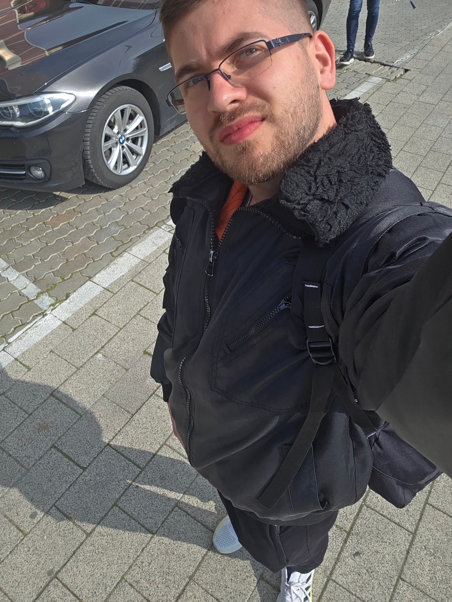 A man with short brown hair and glasses stands next to a dark-colored car, with a portion of the front wheel visible. He is wearing a black jacket with a fur-lined collar and black pants. He is lookin…read more