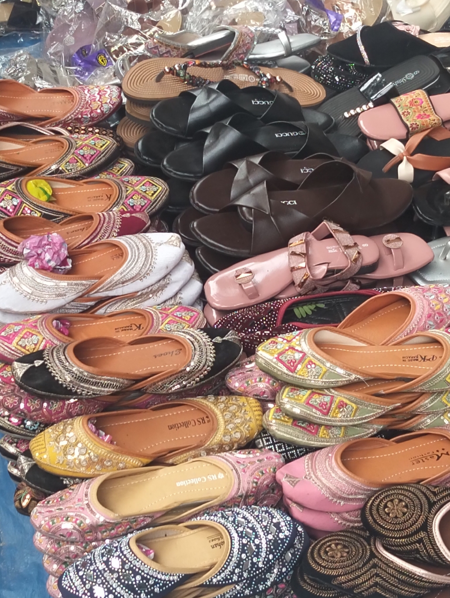 Captured in Dhaka, Bangladesh, this image features a collection of footwear. The assortment includes traditional embroidered Khussa shoes in a variety of colors like pink, yellow, and blue. There areβ¦read more