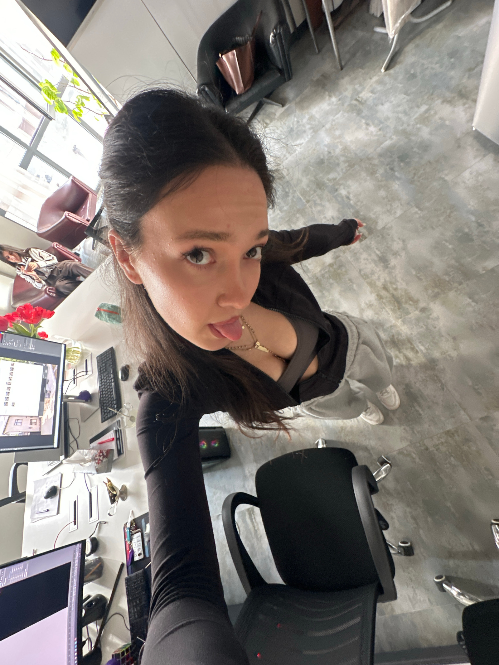 This image depicts an interior scene within an office environment in Zovuni, Armenia, captured from a high-angle selfie perspective. In the foreground, a young adult female with long dark hair, dresse…read more