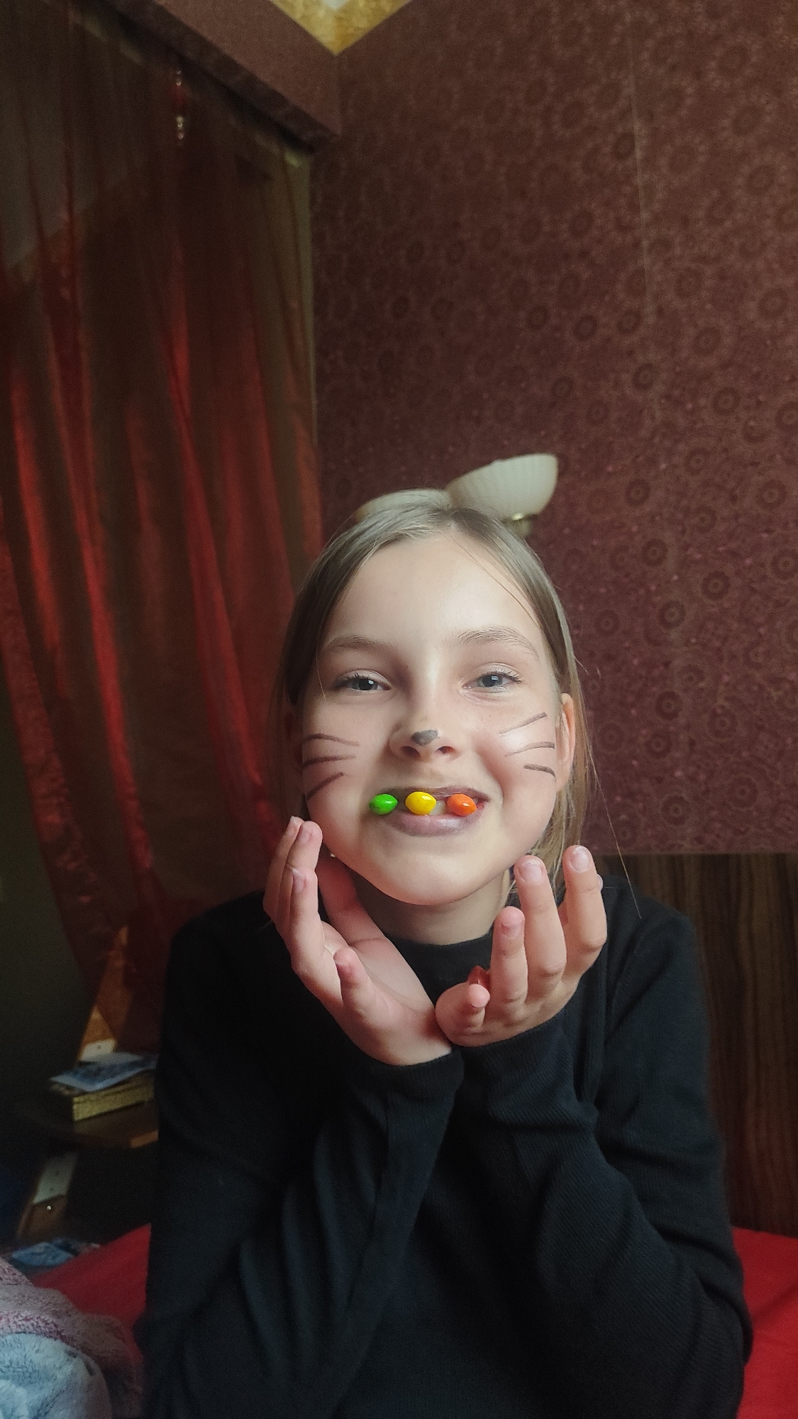 A young girl with blonde hair, cat-like face paint (whiskers and a nose), and three colored candies (green, yellow, and orange) held in her mouth smiles at the camera. She wears a long-sleeved black s…read more