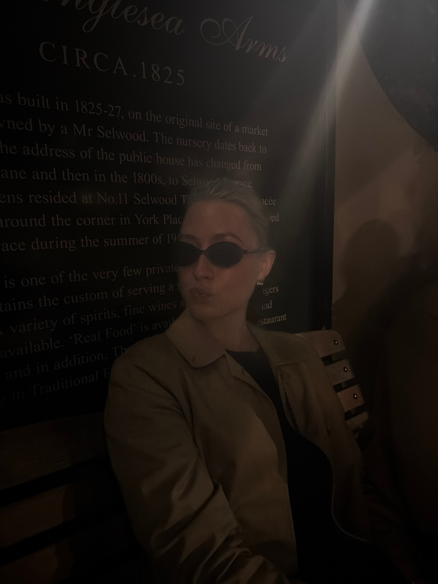 A person wearing sunglasses and a beige jacket is leaning against a plaque with text that reads "Anglesea Arms CIRCA. 1825". The plaque is located in London, United Kingdom, based on the text mentioni…read more