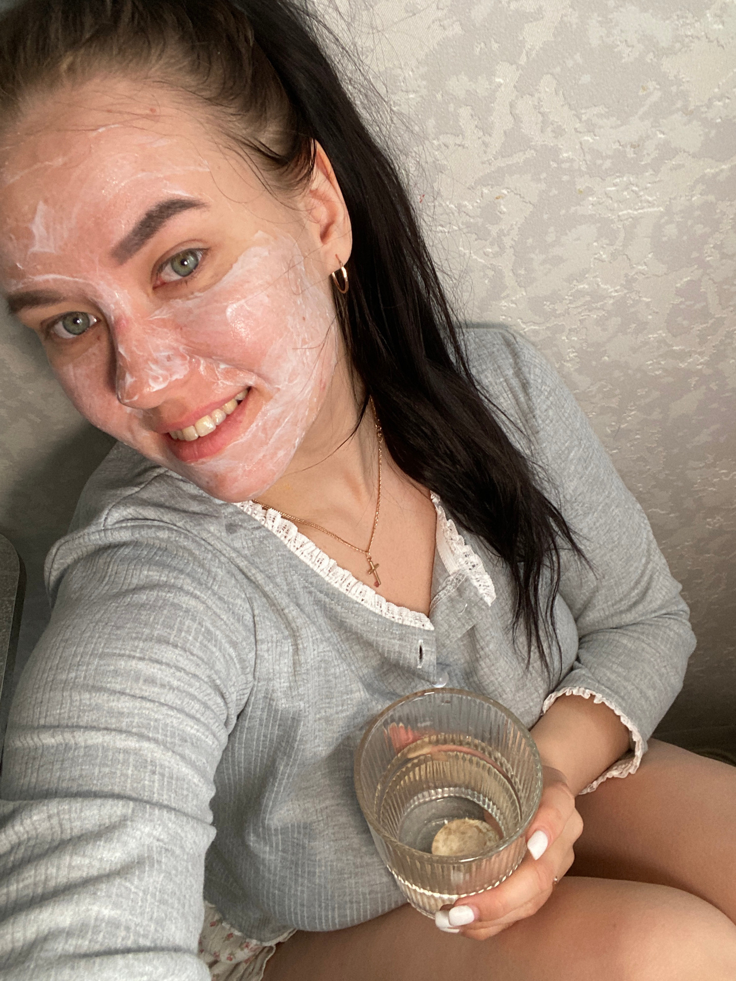 A woman is shown at close range in a low-angle, tilted, indoor shot. Her face is covered with a white substance, presumably a cosmetic face mask, but she is smiling. She has green eyes, dark hair, and…read more