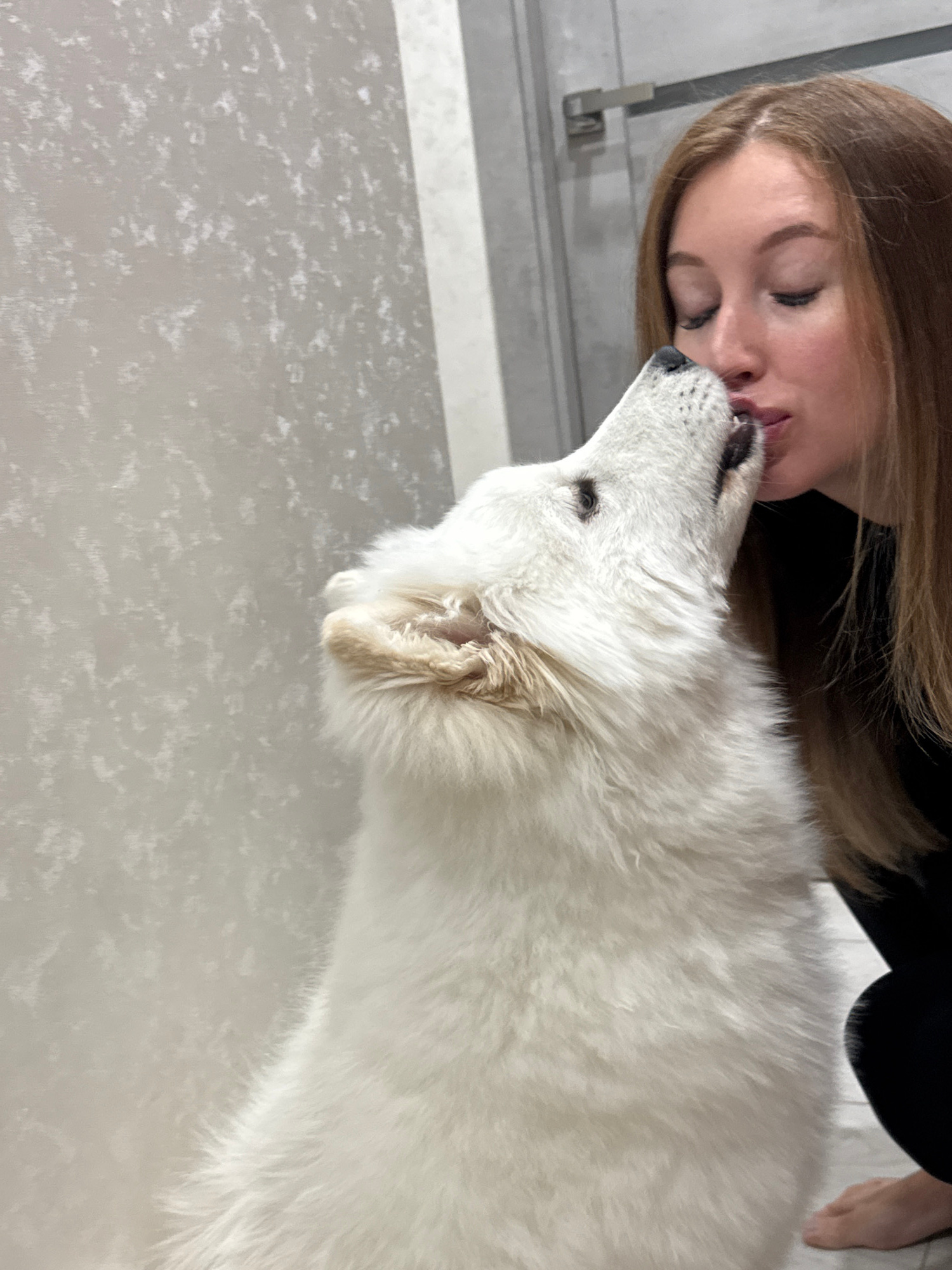 A woman with closed eyes presses her lips against the snout of a white dog. The dog is facing up and to the left. The scene appears to be indoors, with a gray and white patterned surface in the foregr…read more