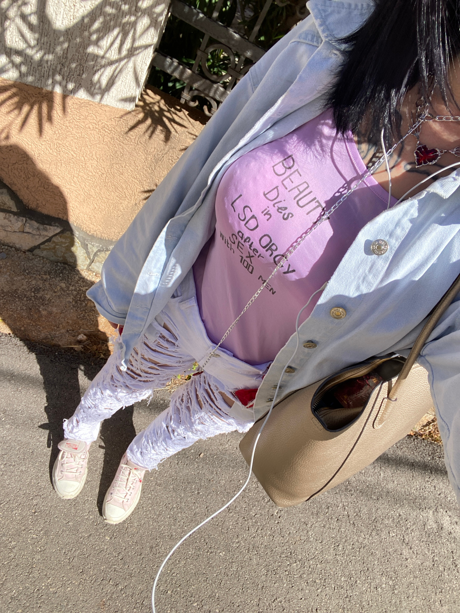 A woman stands on asphalt next to an exterior wall and decorative iron fence, wearing white ripped jeans, pink sneakers, a light purple t-shirt printed with the text "BEAUTY Dies in LSD ORGY after SEX…read more
