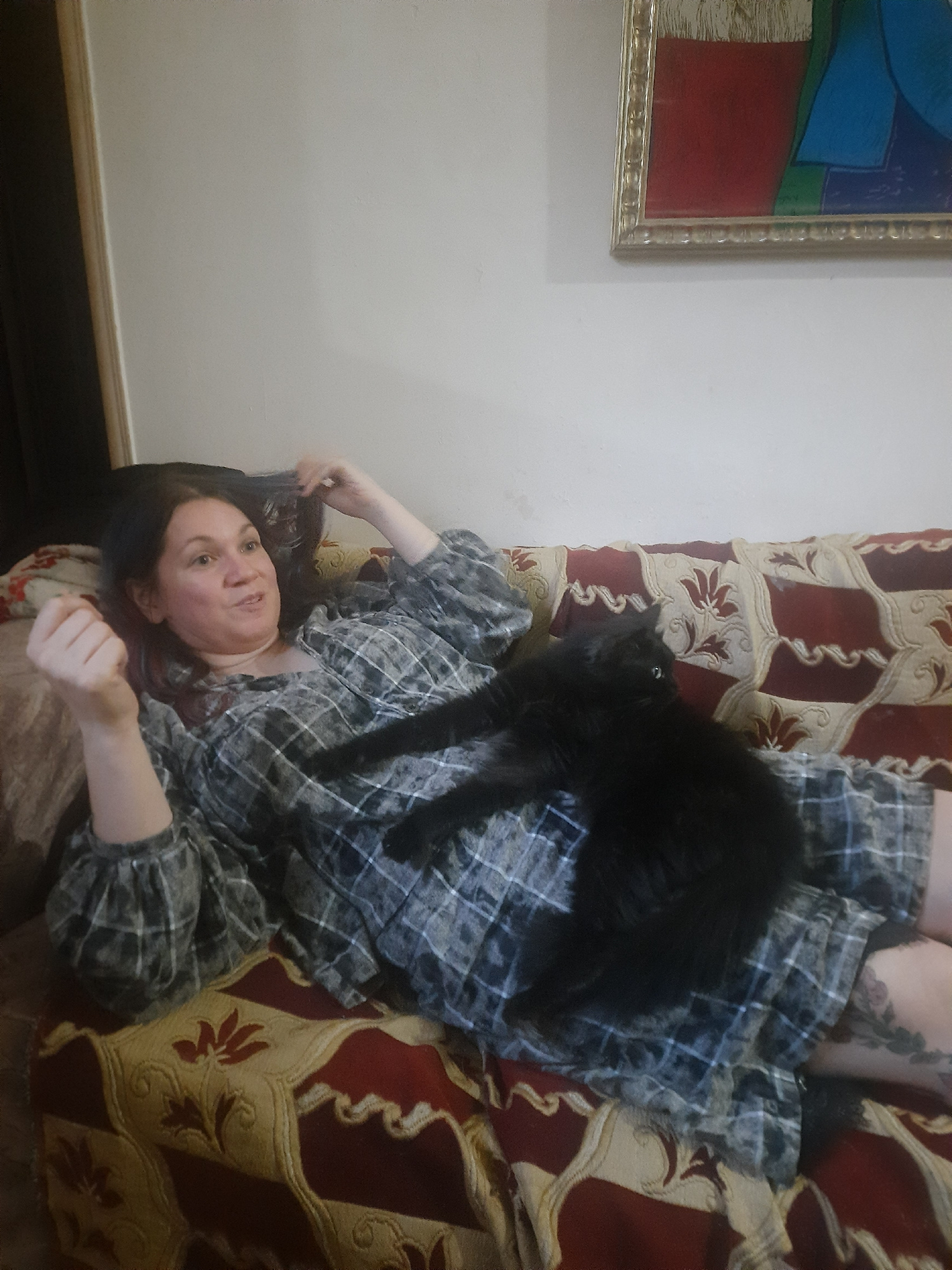 A woman is lying on a couch in Al Hadaba, Egypt. She is wearing a plaid shirt and pants. A black cat is lying on top of her. A painting hangs on the wall. The couch has a red and gold patterned coveri…read more