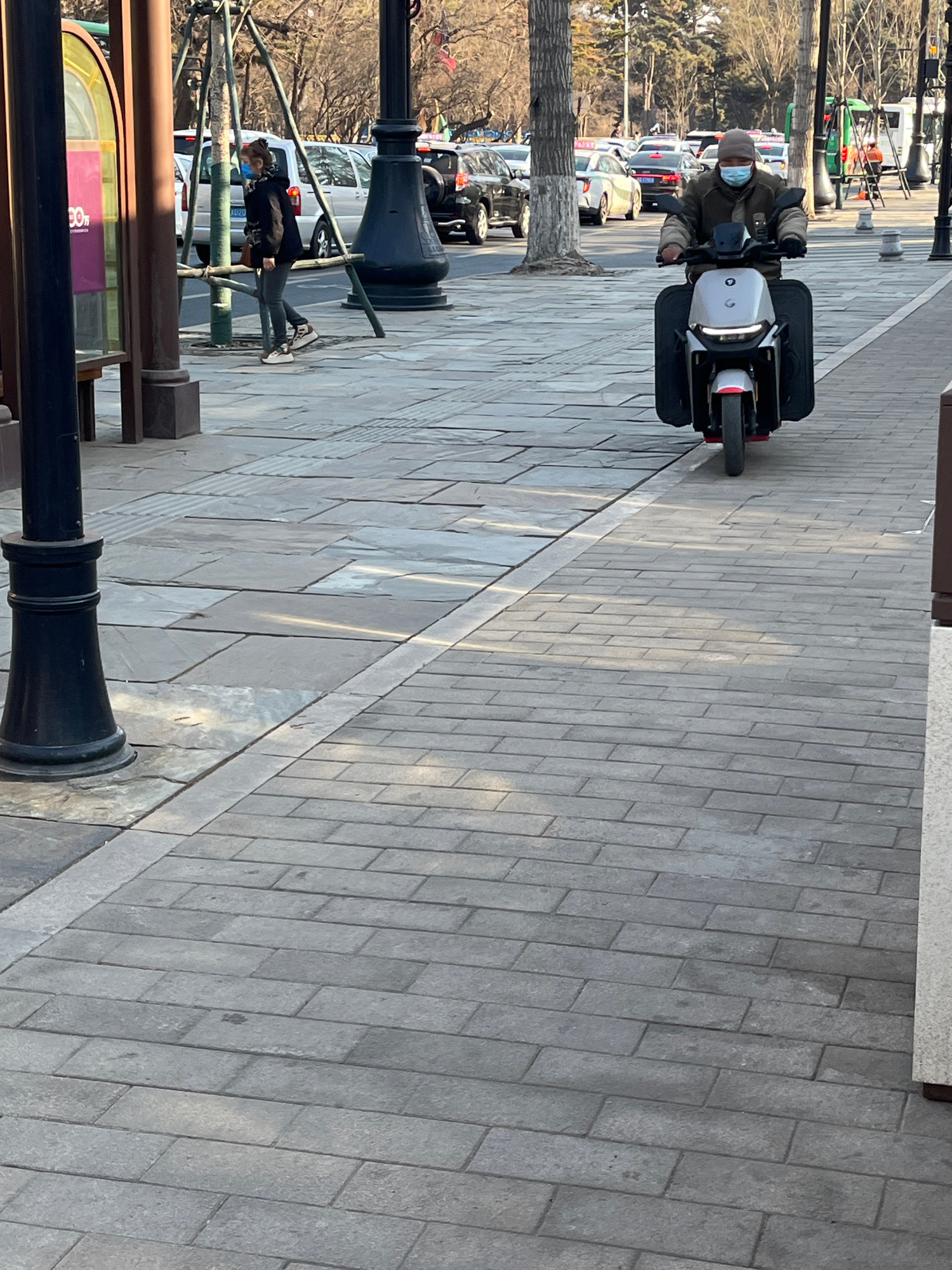 The image depicts an urban scene in Changchun City, China. A person wearing a winter coat, hat, and a face mask is riding a small, electric scooter or moped on a paved sidewalk. The sidewalk is made o…read more