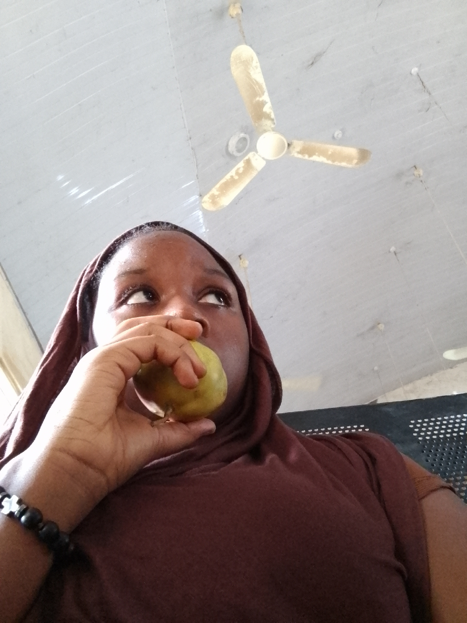 A woman wearing a brown headscarf and a bracelet, sits, holding a round, green object near her mouth, as she looks up. Overhead is a ceiling fan against a white ceiling. The location is Keffi, Nigeria…read more