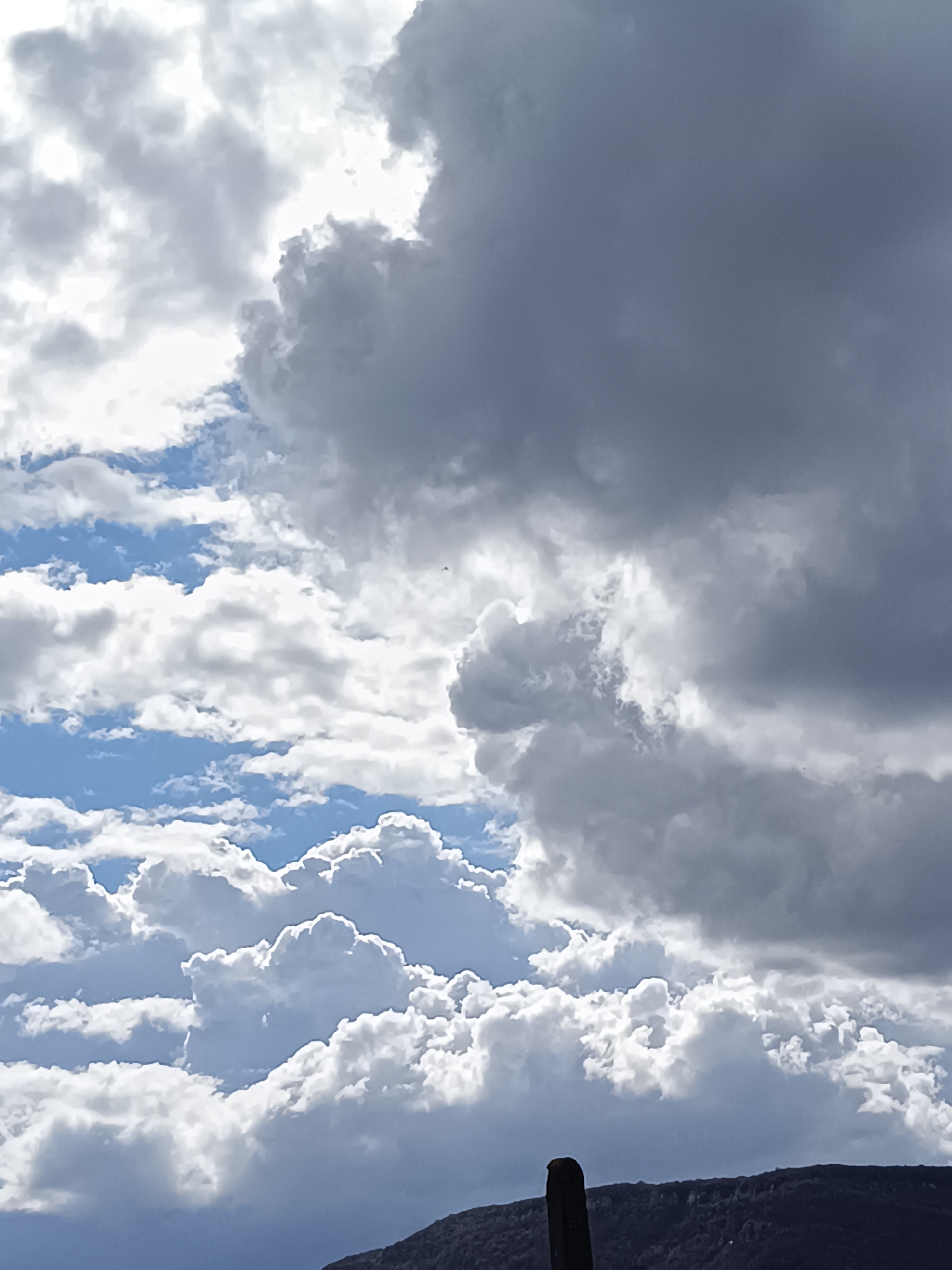 The image shows a cloudy sky with patches of blue visible. There are both dark, storm-like clouds and lighter, fluffy clouds. The bottom of the image reveals a dark, hilly landscape with some vegetati…read more