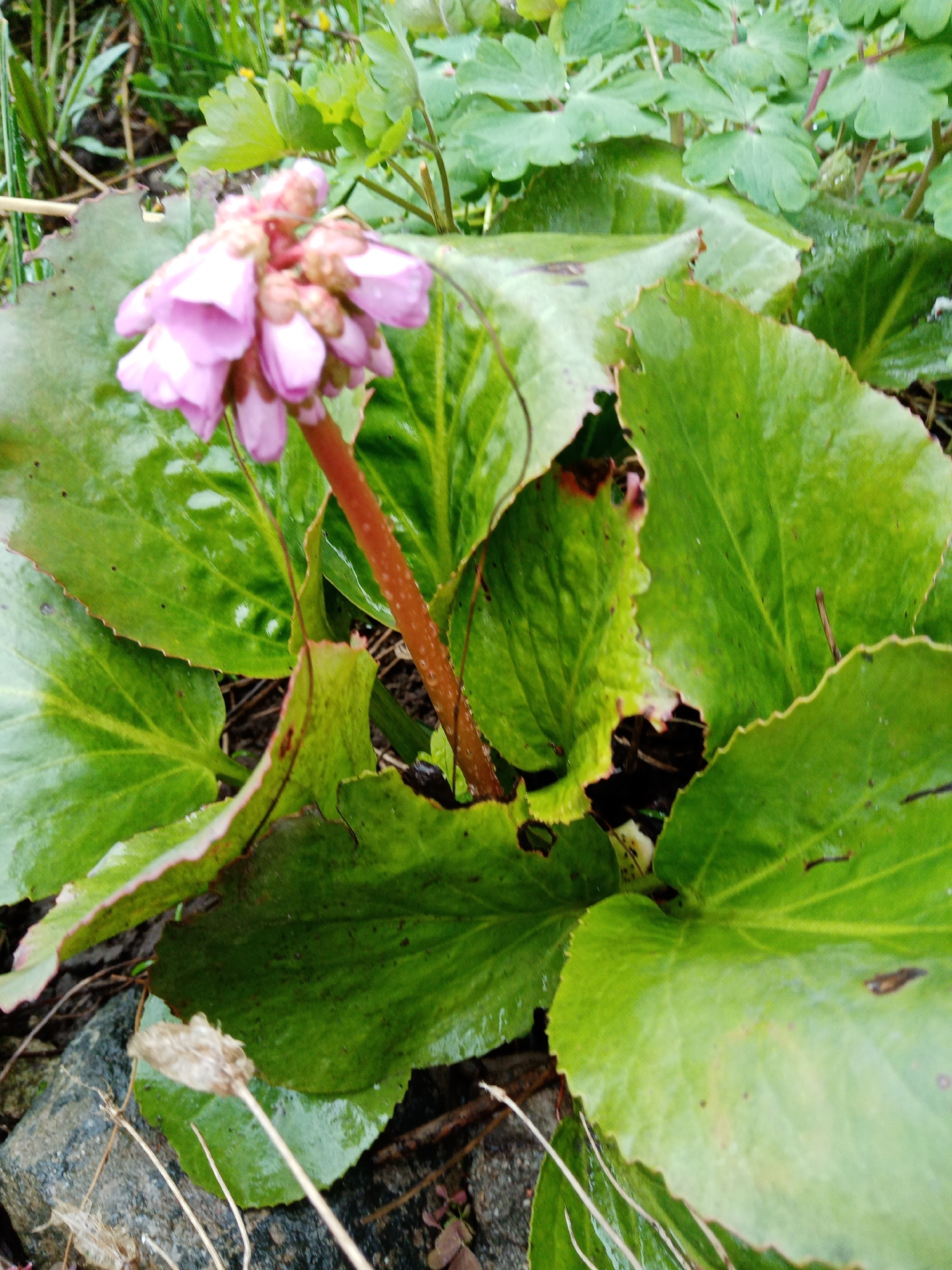 A close-up shot reveals a plant with broad, green leaves and a cluster of pink flowers at the center. The leaves appear wet, possibly from rain or dew. A red stem supports the flower cluster. The imme…read more