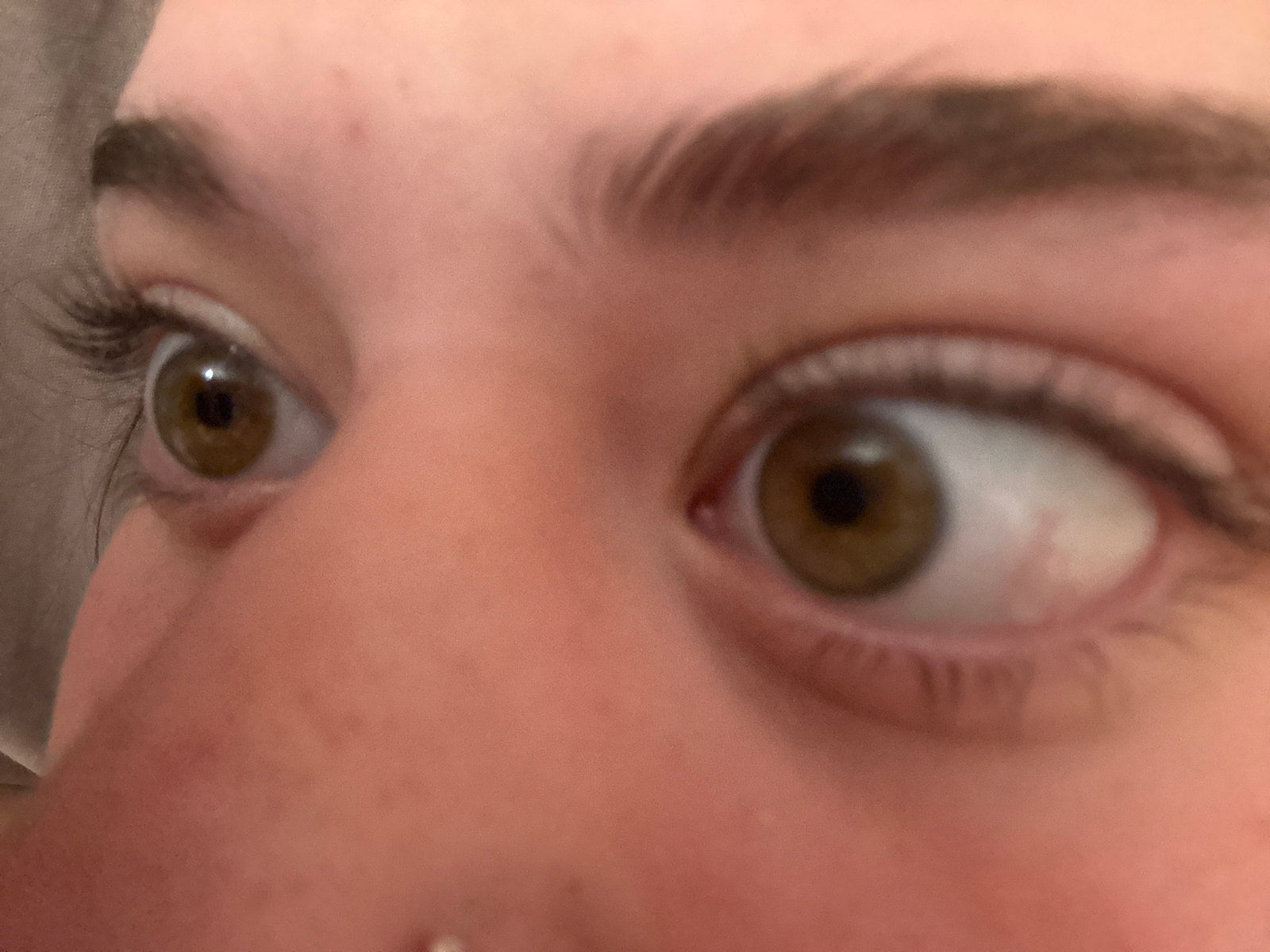 A close-up, slightly out-of-focus image shows a person's eyes. The left eye is directed slightly leftward, while the right eye appears to be looking towards the viewer. The irises are hazel, with dark…read more