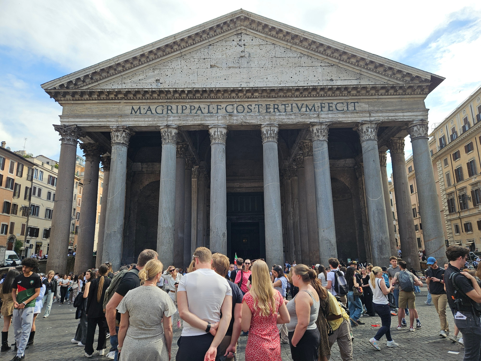 The image shows a ground-level view of the Pantheon in Rome, Italy. The ancient Roman temple stands prominently, with its large columns and triangular pediment bearing the inscription "M·AGRIPPA·L·F·C…read more