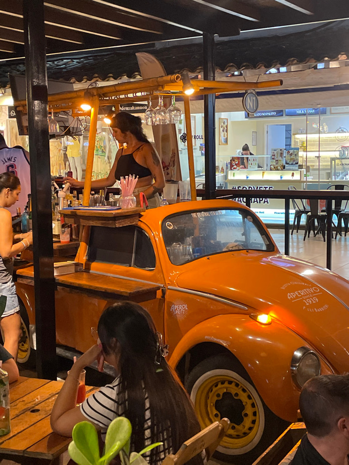 This image captures a nighttime scene within a commercial area of Armação Dos Búzios, Brazil, likely a pedestrian street or open-air food court. The central element is an orange Volkswagen Beetle, cus…read more
