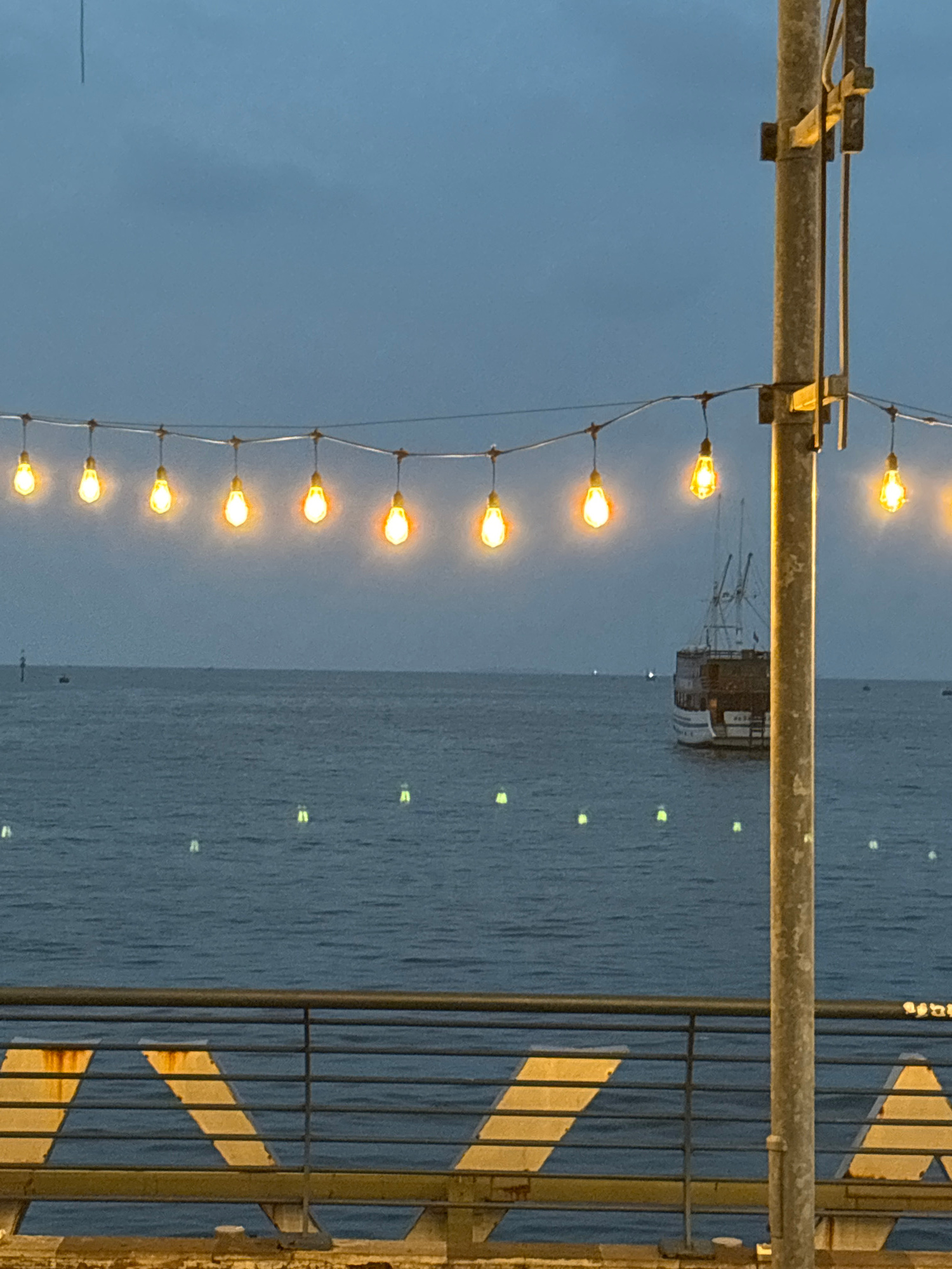 An eye-level outdoor shot shows the sea at dusk, viewed between string lights, a metal railing and metal support. The string lights are visible on the left side. The gray water is on the right and isβ¦read more