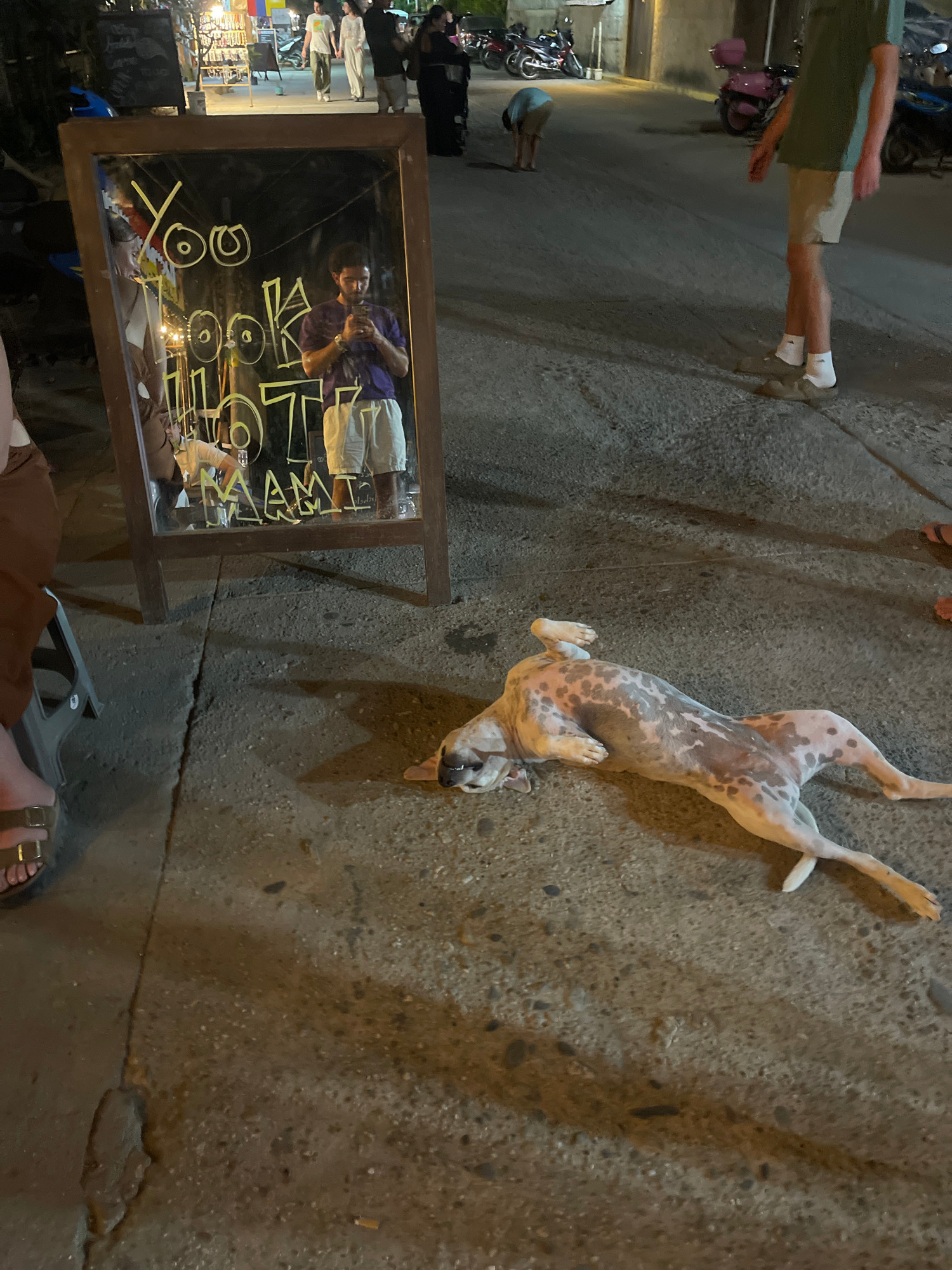 The image shows a concrete street scene in Brisas de Zicatela, Mexico. A dog is lying on its back in the middle of the street. The dog is white with grey spots. A wooden framed sign with reflective wr…read more