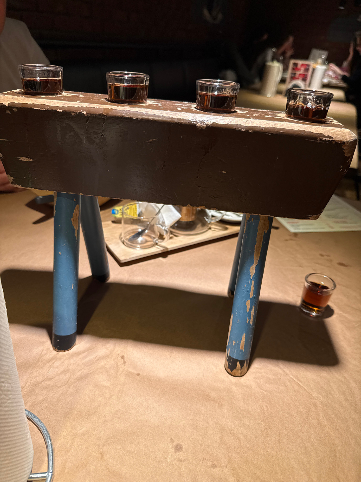 The image presents a close-up, low-angle view of a rustic, rectangular wooden stool functioning as a shot glass holder on a table within a dimly lit establishment in Prague, Czechia. The stool featureβ¦read more