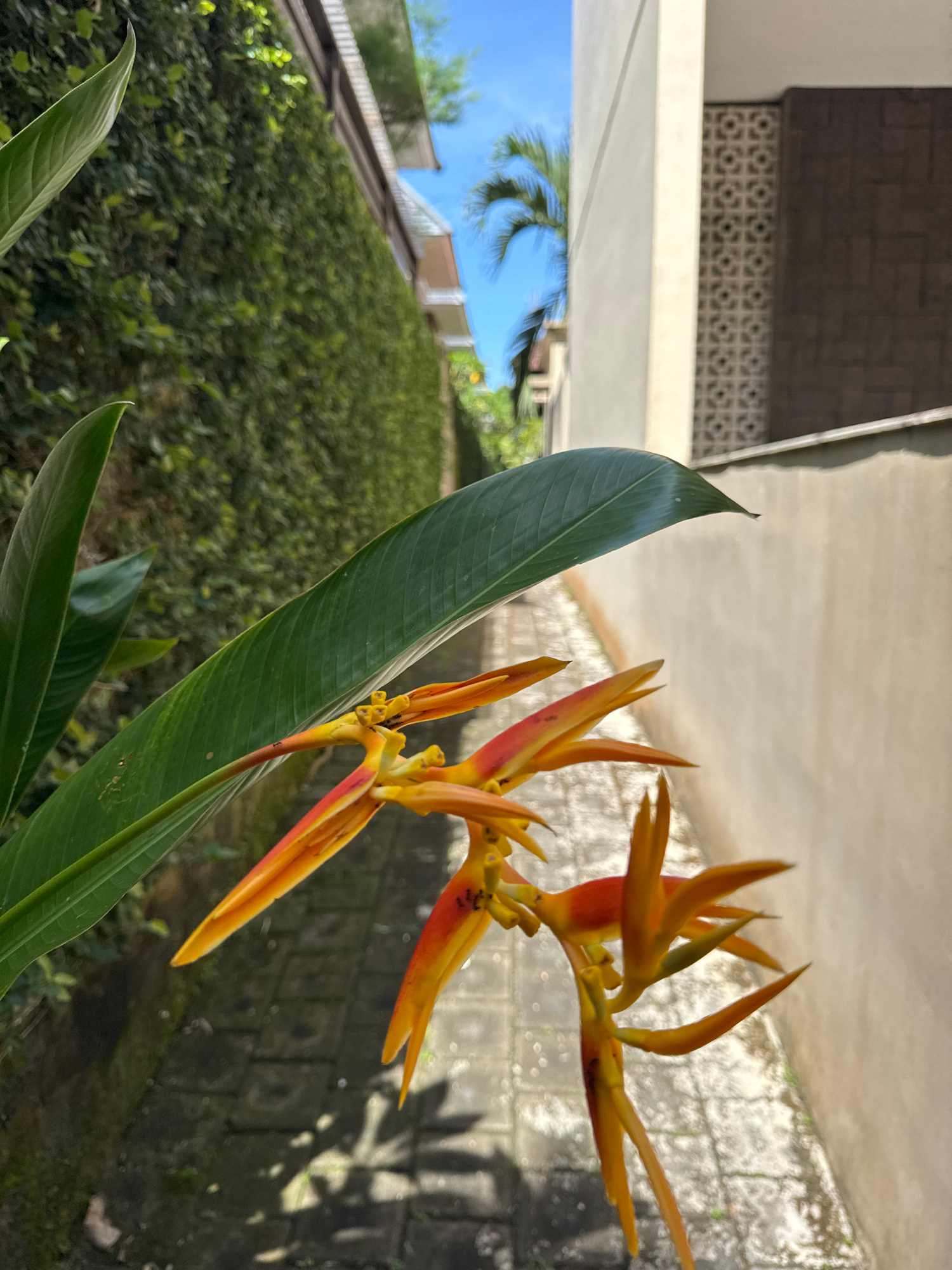 The image depicts a close-up of Heliconia psittacorum flowers with lush green foliage in Kuta Selatan, Indonesia. The vibrant orange and yellow flowers are in focus, with a blurred background revealin…read more