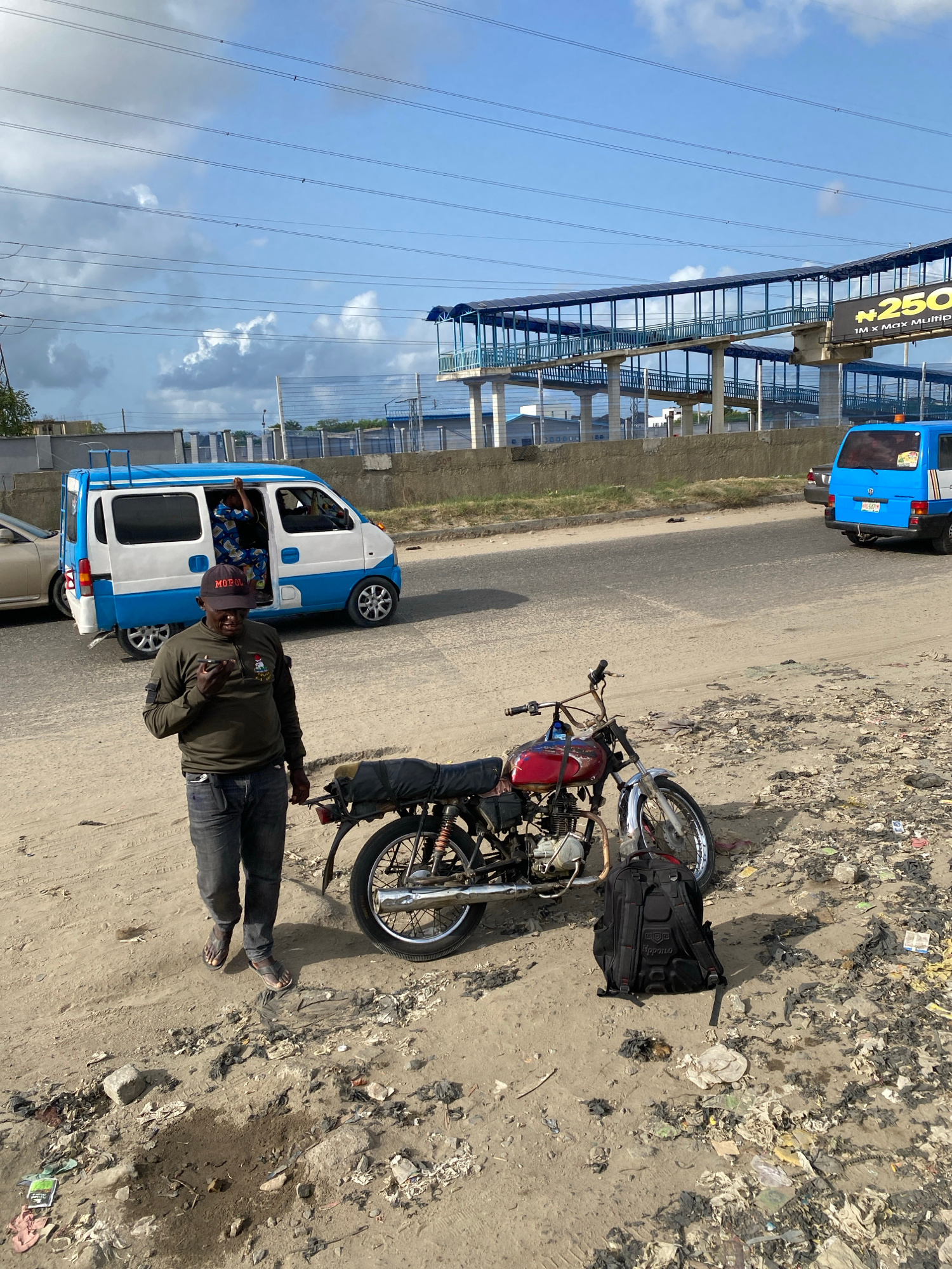 The image shows a street scene in Lekki, Nigeria. A man wearing a black cap, green long-sleeved shirt, and jeans stands next to a motorcycle lying on its side amidst scattered trash along the edge of…read more