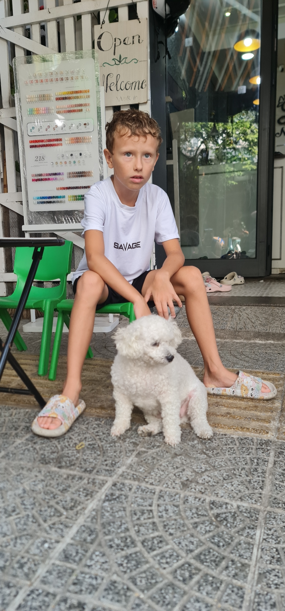 A young boy with light skin and curly blond hair sits on a green plastic chair next to a small white dog on a patterned gray-colored stone surface. The boy is wearing a white t-shirt with "SAVAGE" pri…read more