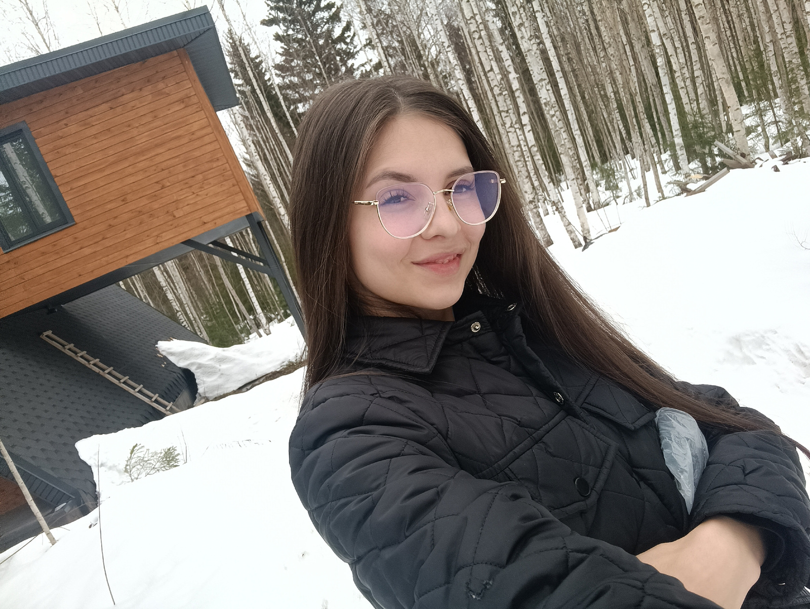A young woman with long brown hair and light pink glasses stands in a snowy landscape, likely near a forest of birch trees, as evidenced by the dense collection of slender, white-barked trees in the b…read more