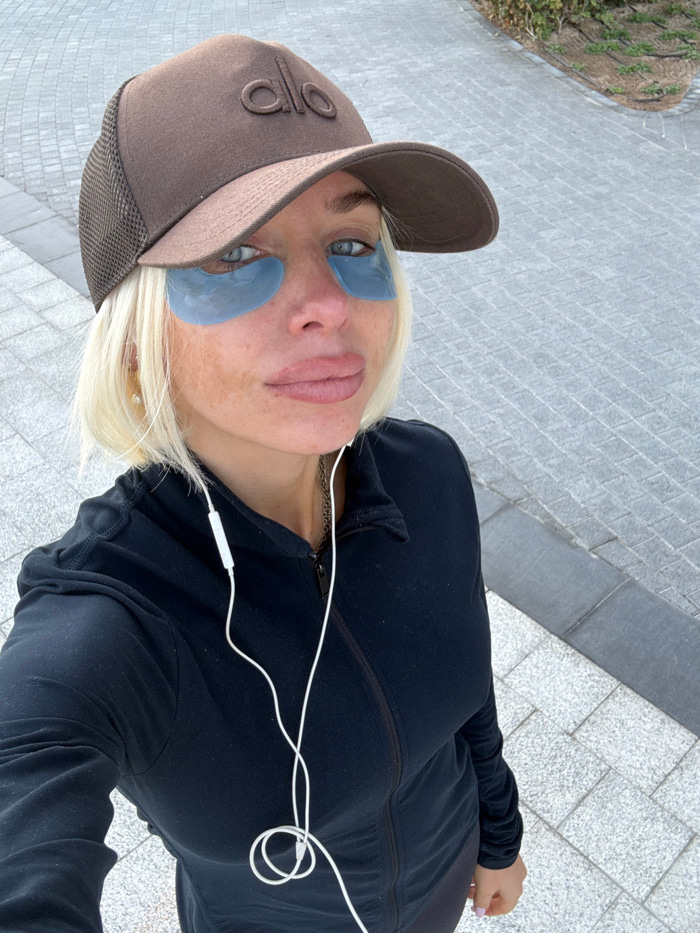 A woman wears a brown Alo cap and under-eye patches. She has blonde hair and is wearing a black zip-up jacket. White earphones are tangled near her neck. She stands on a gray tiled surface with greene…read more