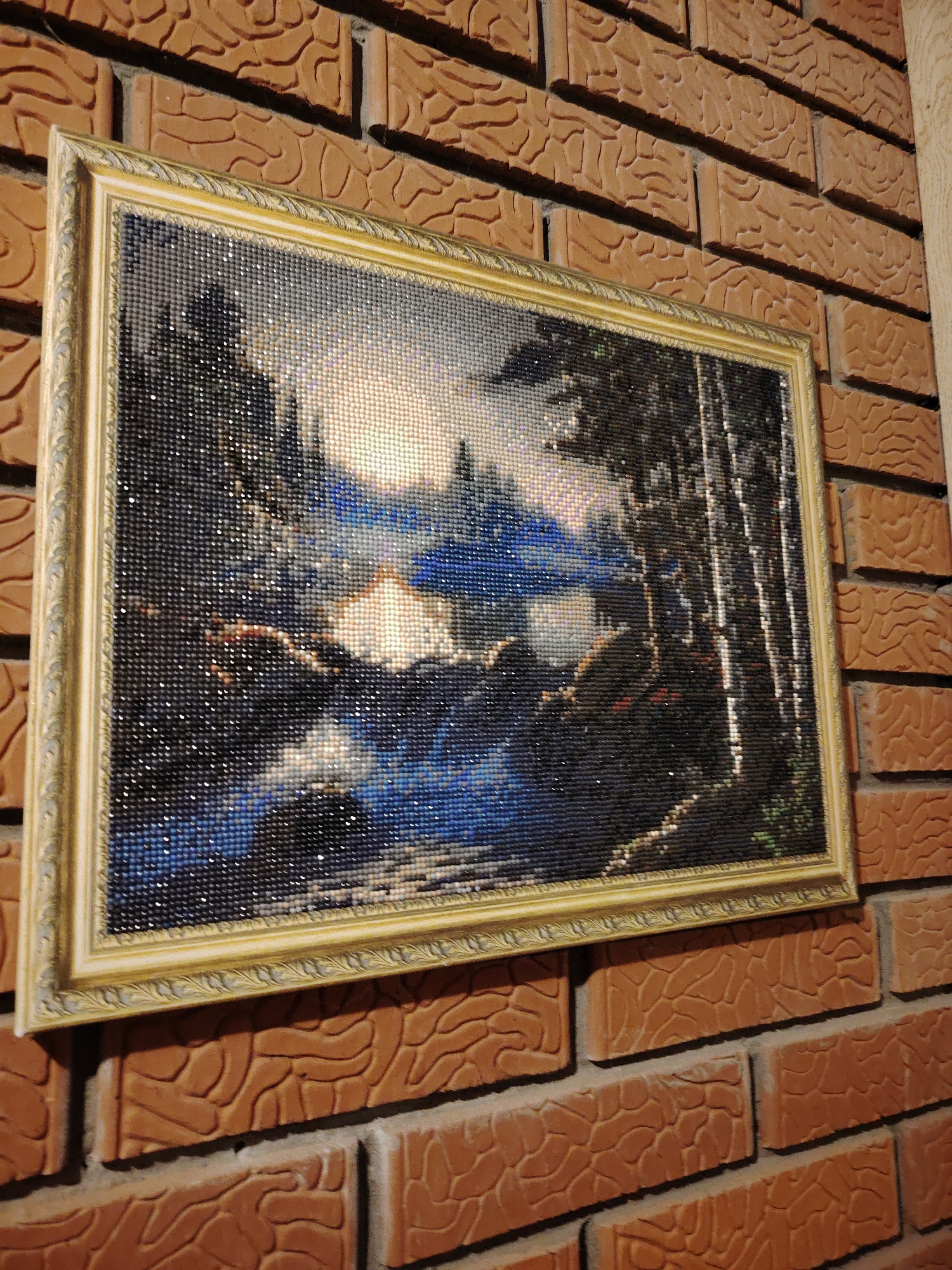 A framed, rectangular artwork hangs on a brick wall. The artwork depicts a landscape with trees, a body of water, and a light-filled sky. The artwork appears to be created using small, sparkling eleme…read more