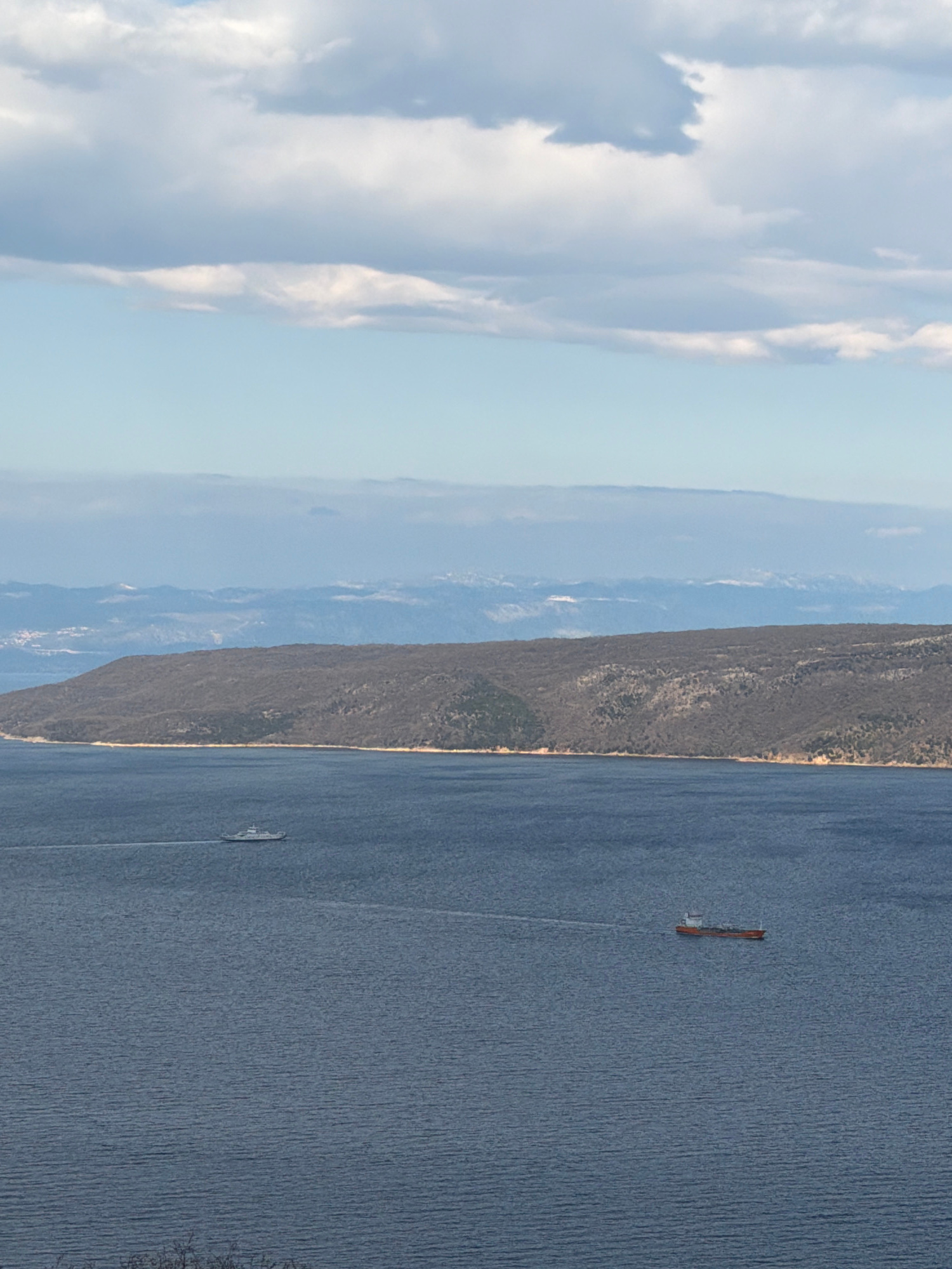The image presents a body of water bordered by land, potentially a lake or sea near Zagorje, Croatia. In the distance, a mountain range stretches across the horizon under a sky filled with soft, billo…read more