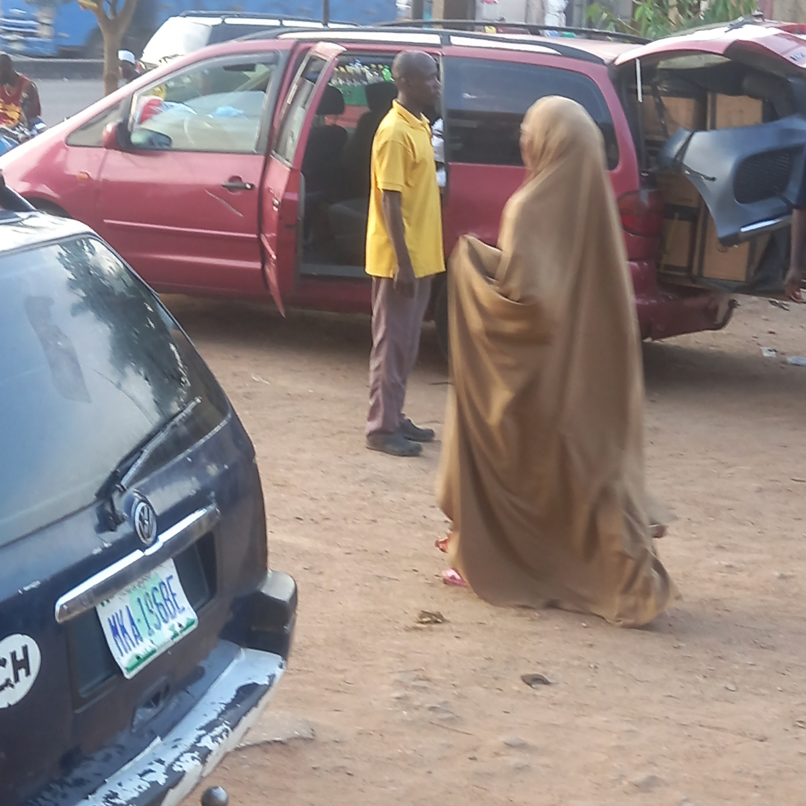 The image depicts an outdoor scene in what appears to be a street or roadside area in Dadi Riba, Nigeria. The ground is unpaved, consisting of dirt or sand. Two people are visible. One person, to the…read more
