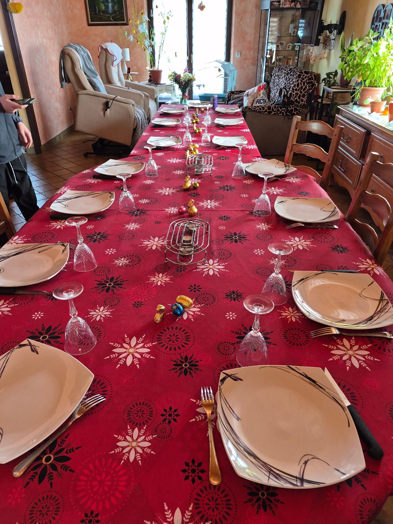 A long table is set for a meal, covered with a red tablecloth patterned with white and black floral designs. Along the table are several square white plates with black markings, each accompanied by a…read more