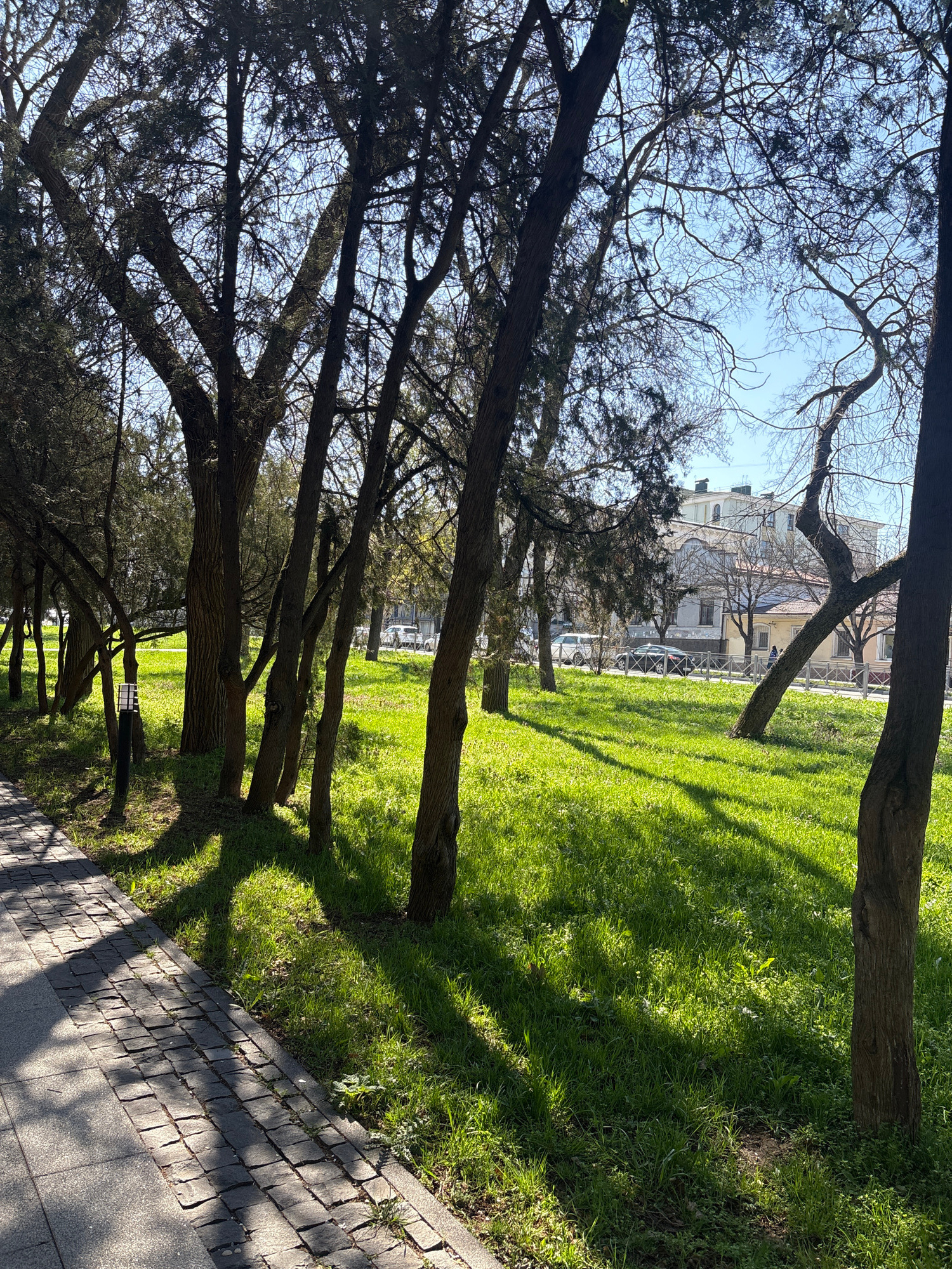 The image shows a park in Simferopol, Ukraine. A row of trees lines a paved walkway, casting shadows on the path and the adjacent green grass. In the background, there are buildings, cars, and possibl…read more