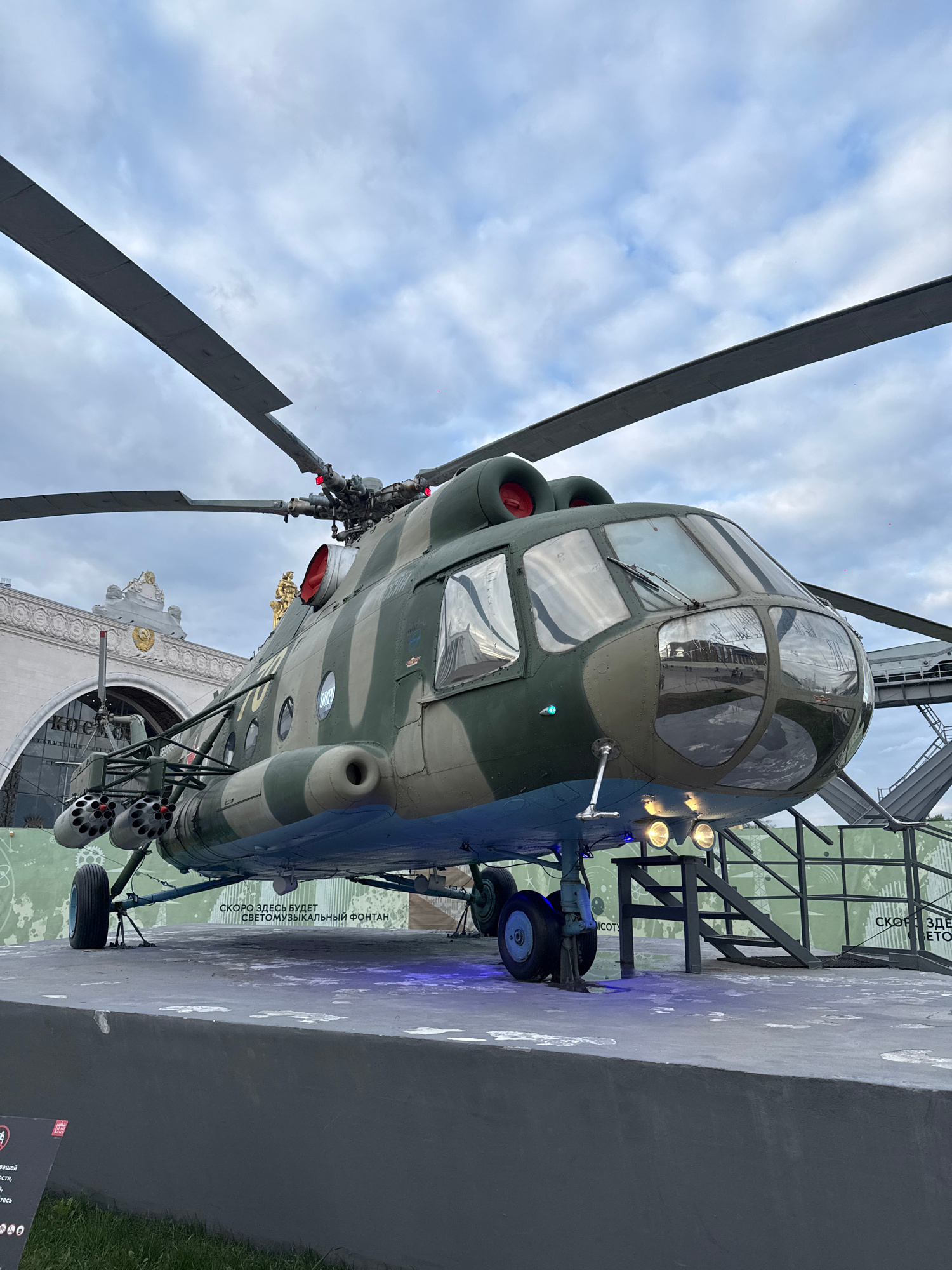 The image shows a military helicopter on display at the Exhibition of Achievements of National Economy (VDNKh) in Moscow, Russia. The helicopter is painted in a camouflage pattern of green and blue, w…read more