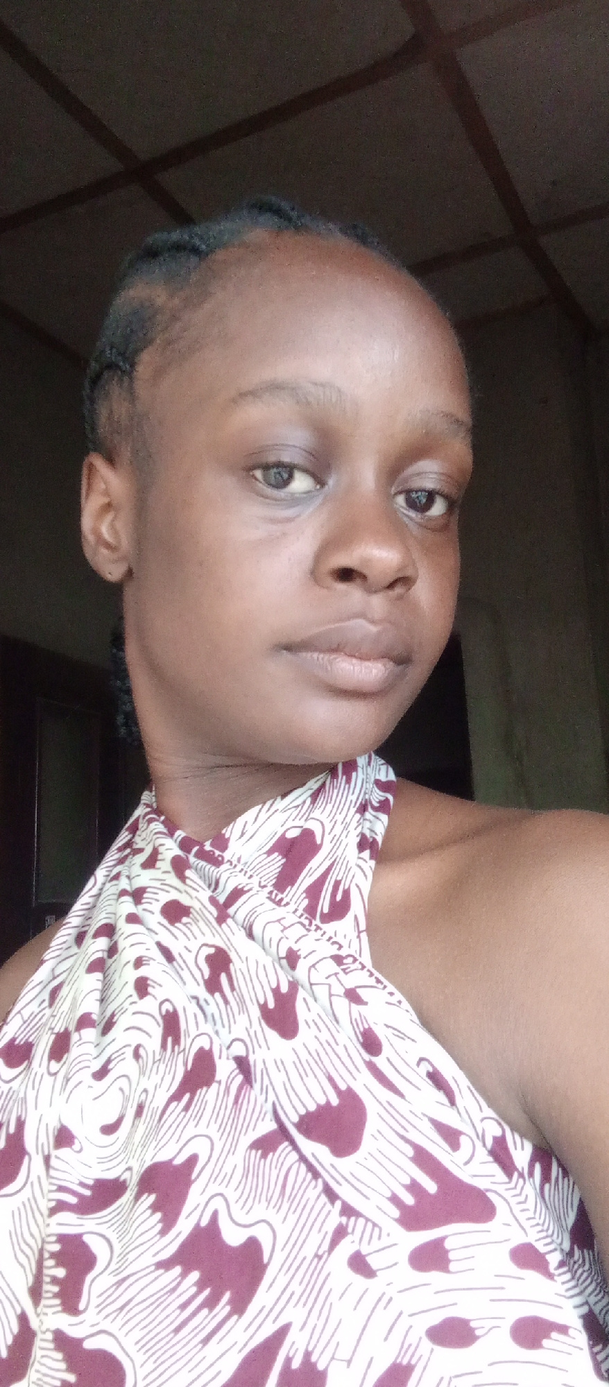A young woman with dark skin is depicted in a close-up, chest-up portrait, likely taken indoors in Akwanga, Nigeria. She has short, dark hair styled in what appear to be braids or cornrows visible aro…read more