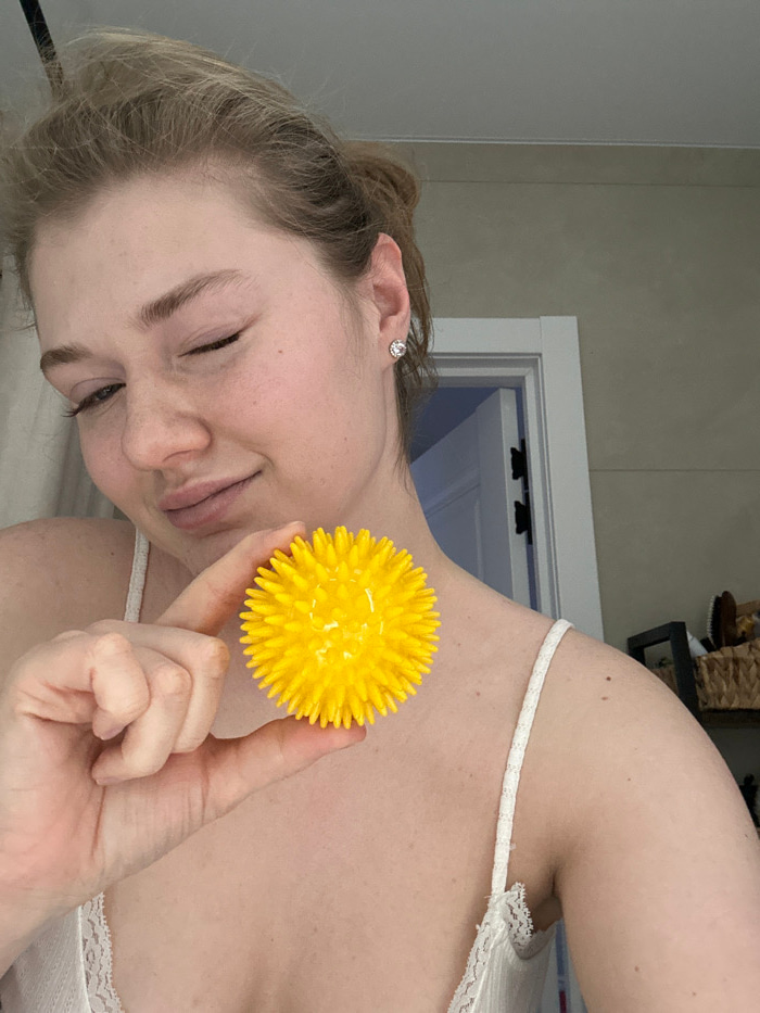 A woman lies on her side, holding a yellow spiky ball. She wears a light-colored camisole with lace detailing. Her blond hair is pulled back, revealing an earring. She has fair skin and is smiling sli…read more