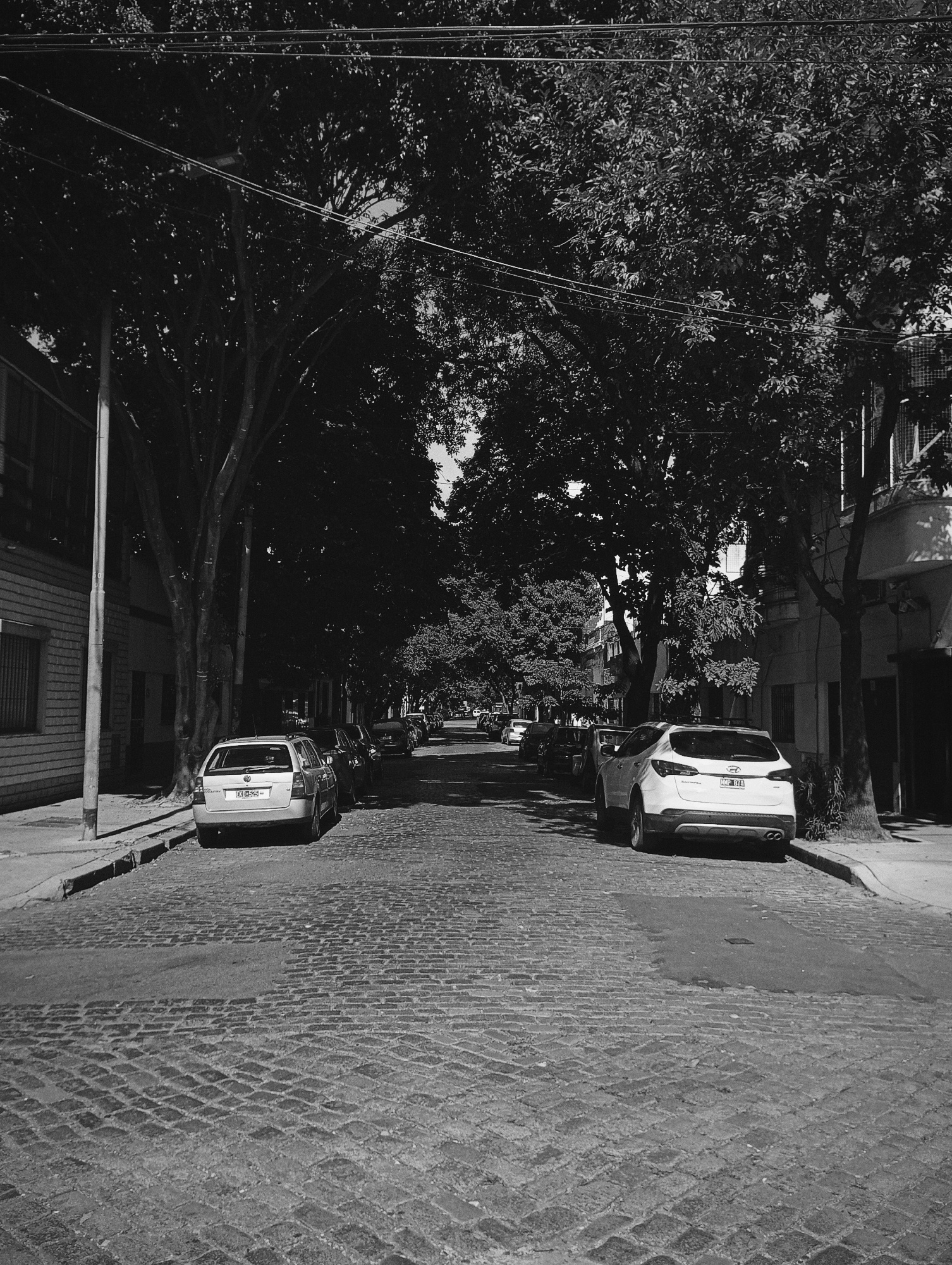 This black and white image depicts a street in Buenos Aires, Argentina, lined with trees and parked cars on either side of a cobblestone street. The buildings flanking the street are multi-story resid…read more