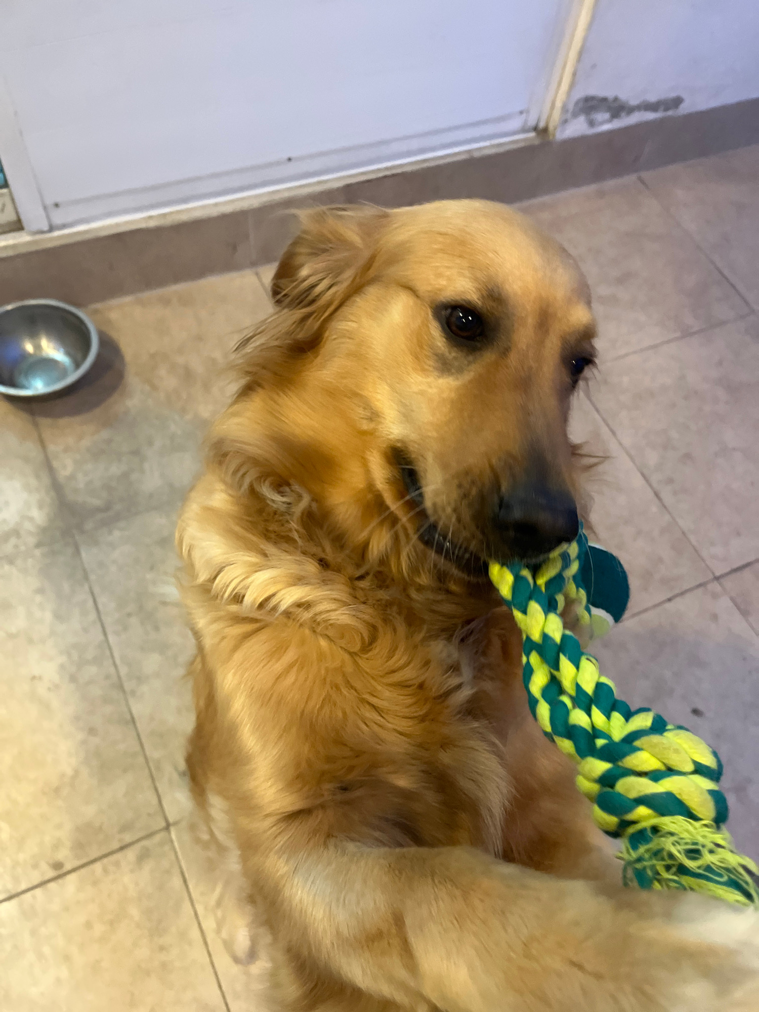 An indoor, vertically oriented image captures a Golden Retriever dog actively playing with a vibrant yellow and green braided rope toy. The dog, with its golden-brown fur and bright, dark eyes, holds…read more