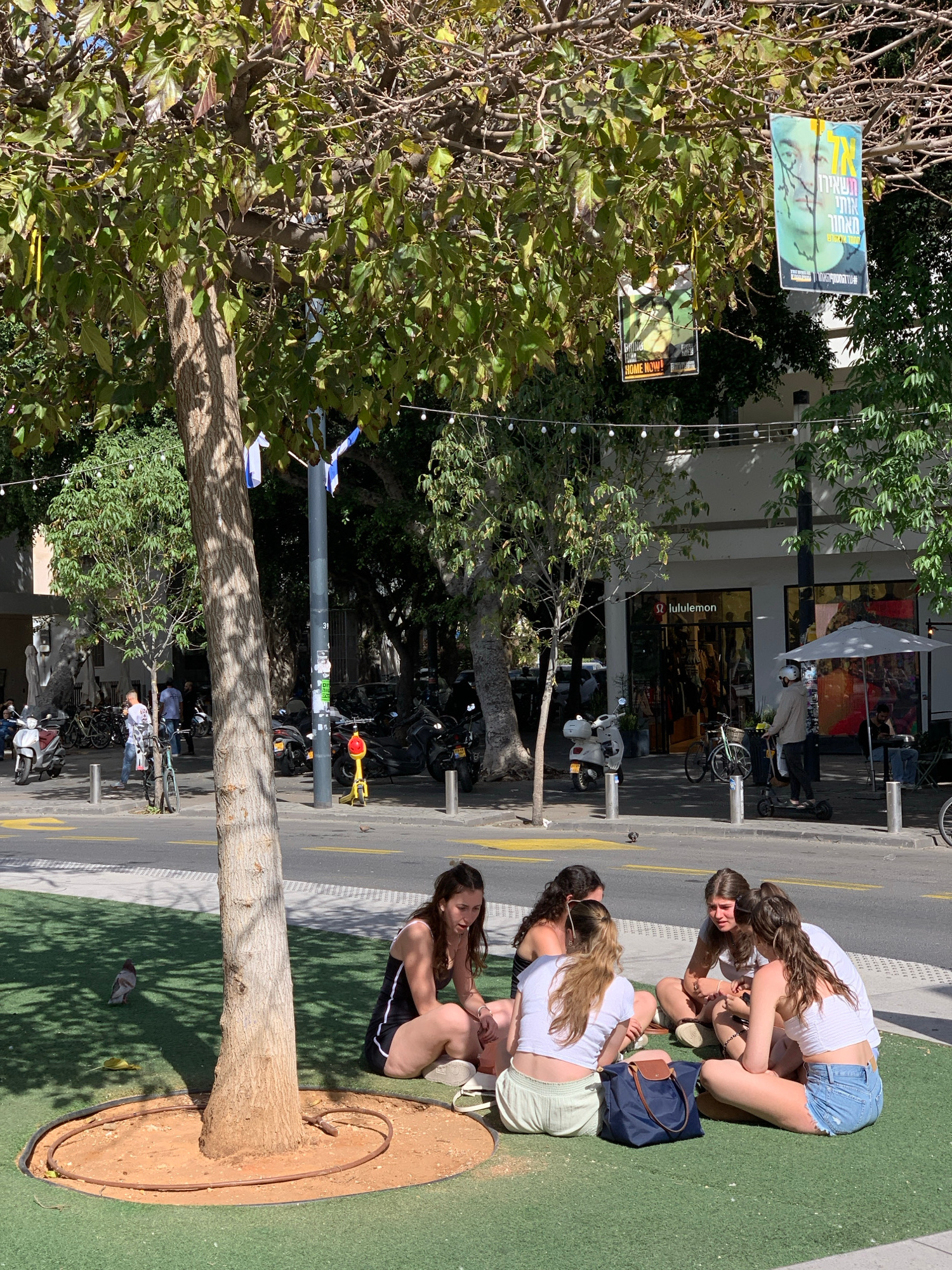 Four young women are seated on the ground near a tree in what appears to be a street in Tel Aviv, Israel. They are congregated closely, possibly engaged in conversation or using their phones. The stre…read more