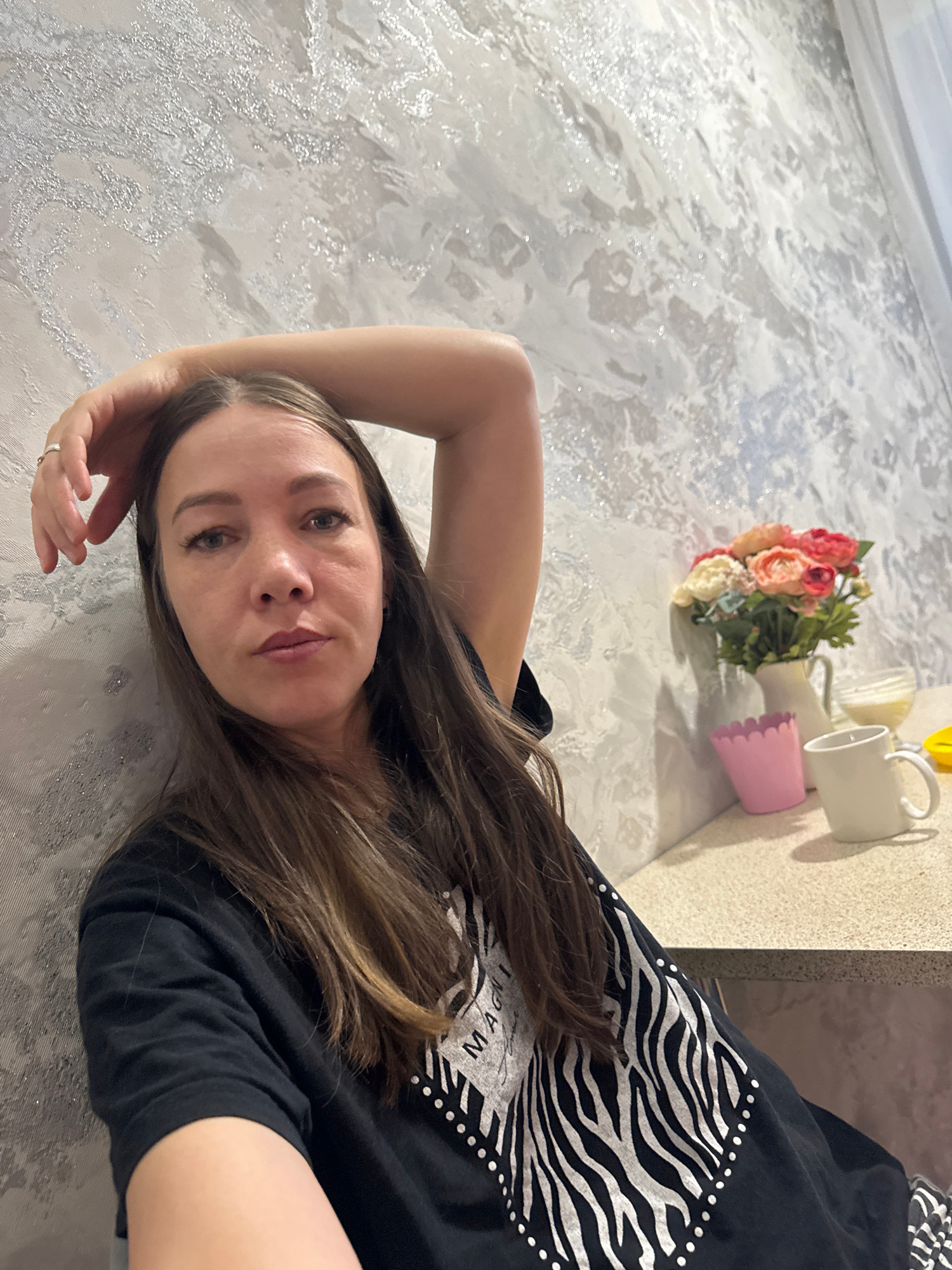 A woman is lying on a gray marble-patterned surface, possibly a floor or countertop. She is wearing a black t-shirt with a zebra stripe design. Her brown hair is partially covering the shirt and resti…read more