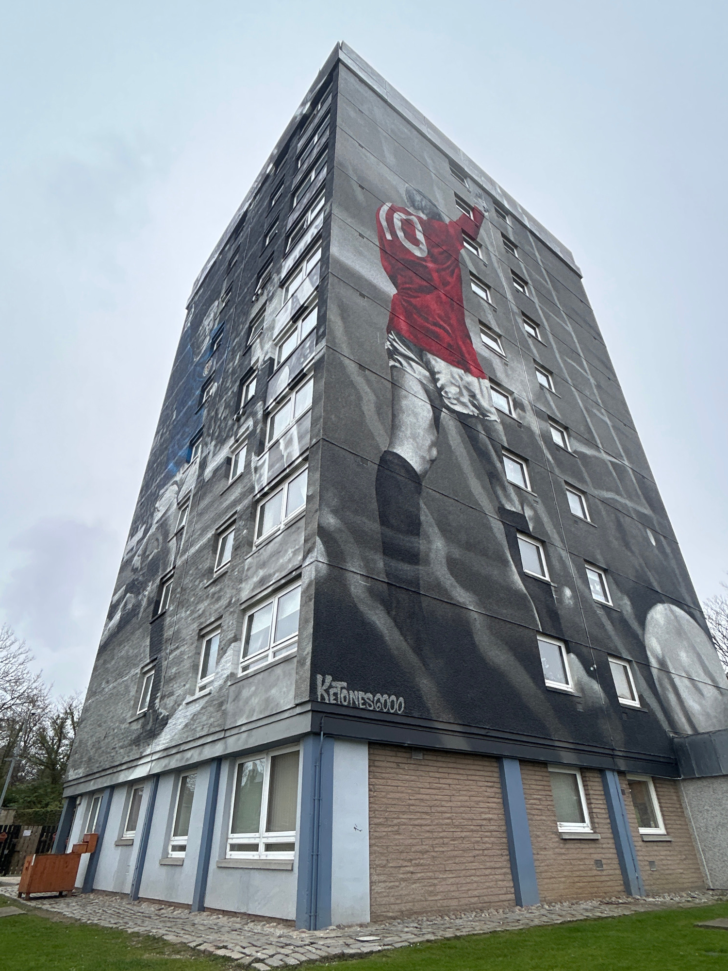 The image shows a tall building in Aberdeen City, United Kingdom, viewed from a low angle. The building's facade features a large-scale mural depicting a person wearing a red jersey with a prominent n…read more