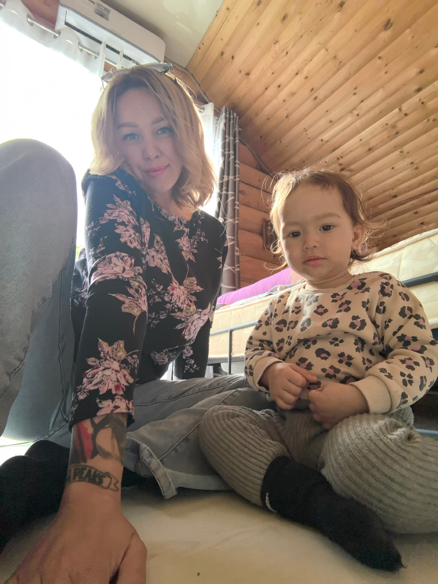 A fair-skinned woman with blonde hair and a floral-patterned top sits on the floor, her left arm visible with a tattoo, next to a young child with reddish-brown hair and a leopard-print sweater. The c…read more