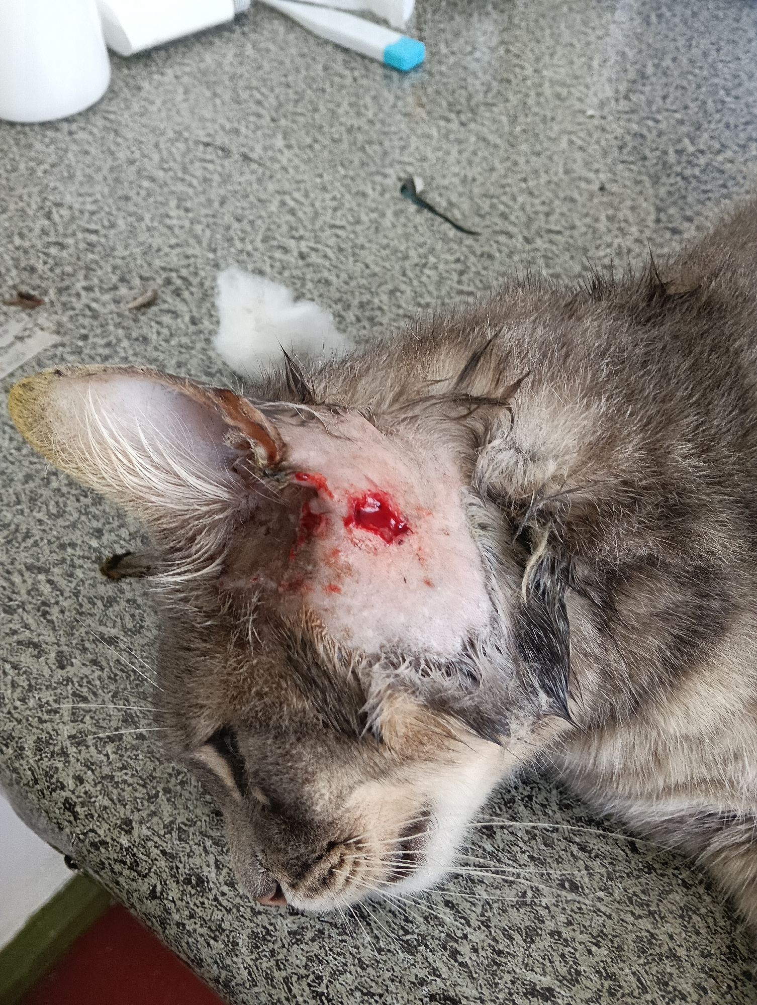 A close-up shot depicts a gray tabby cat lying on a patterned gray surface. The cat has a severe head wound with visible blood near its left ear. The fur around the wound appears to have been shaved.…read more