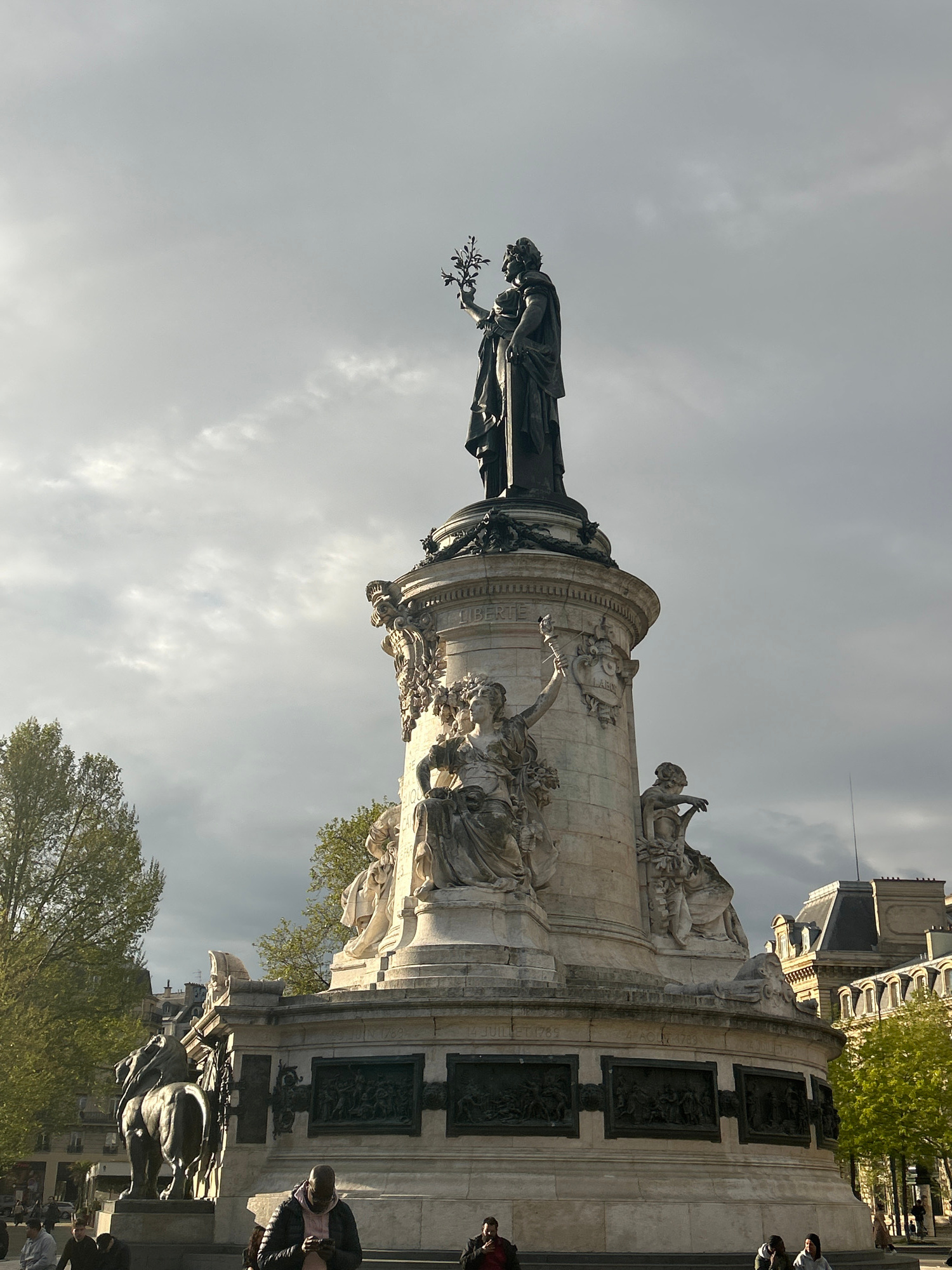 The image shows the Place de la République monument in Paris, France, a large central statue of Marianne (symbolizing the French Republic) atop a tall pedestal adorned with sculptures and bronze plaqu…read more