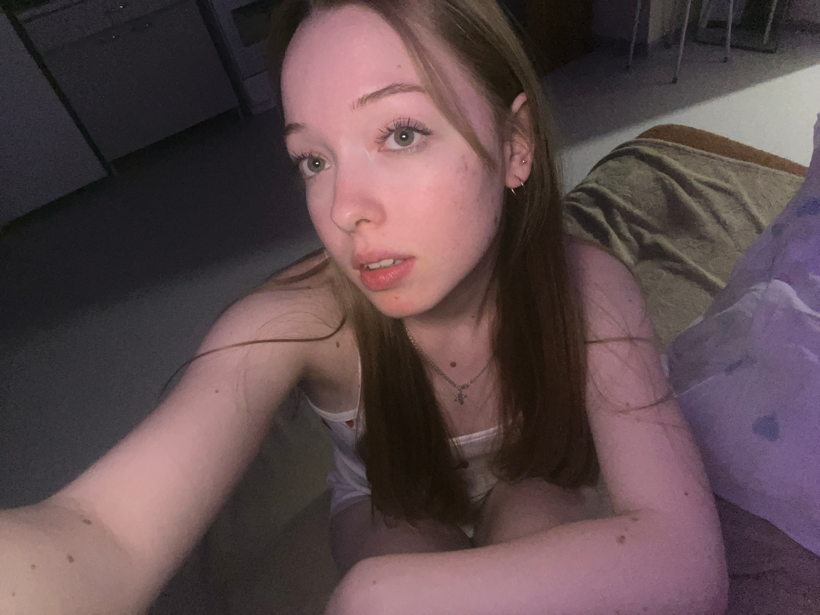 A portrait-oriented selfie captures a young female from an upside-down perspective, suggesting she is lying down. Her face, positioned in the lower center of the frame, looks directly at the camera wiβ¦read more
