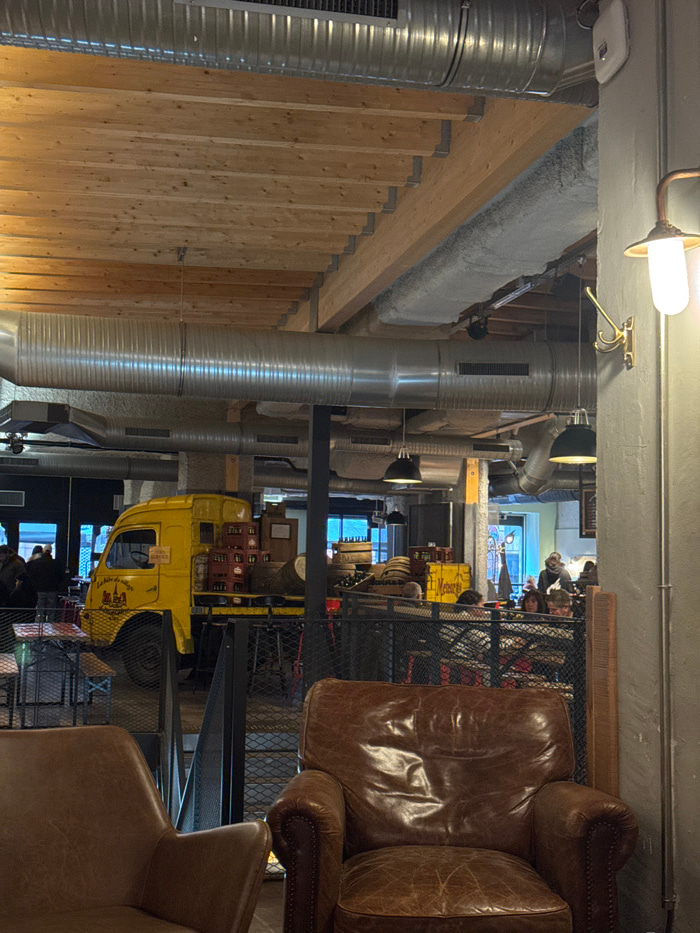 The image displays the interior of "La Robe du Berger," a restaurant or brewery located in Strasbourg, France. The scene is viewed from a slightly elevated position, overlooking a dining area. In the…read more