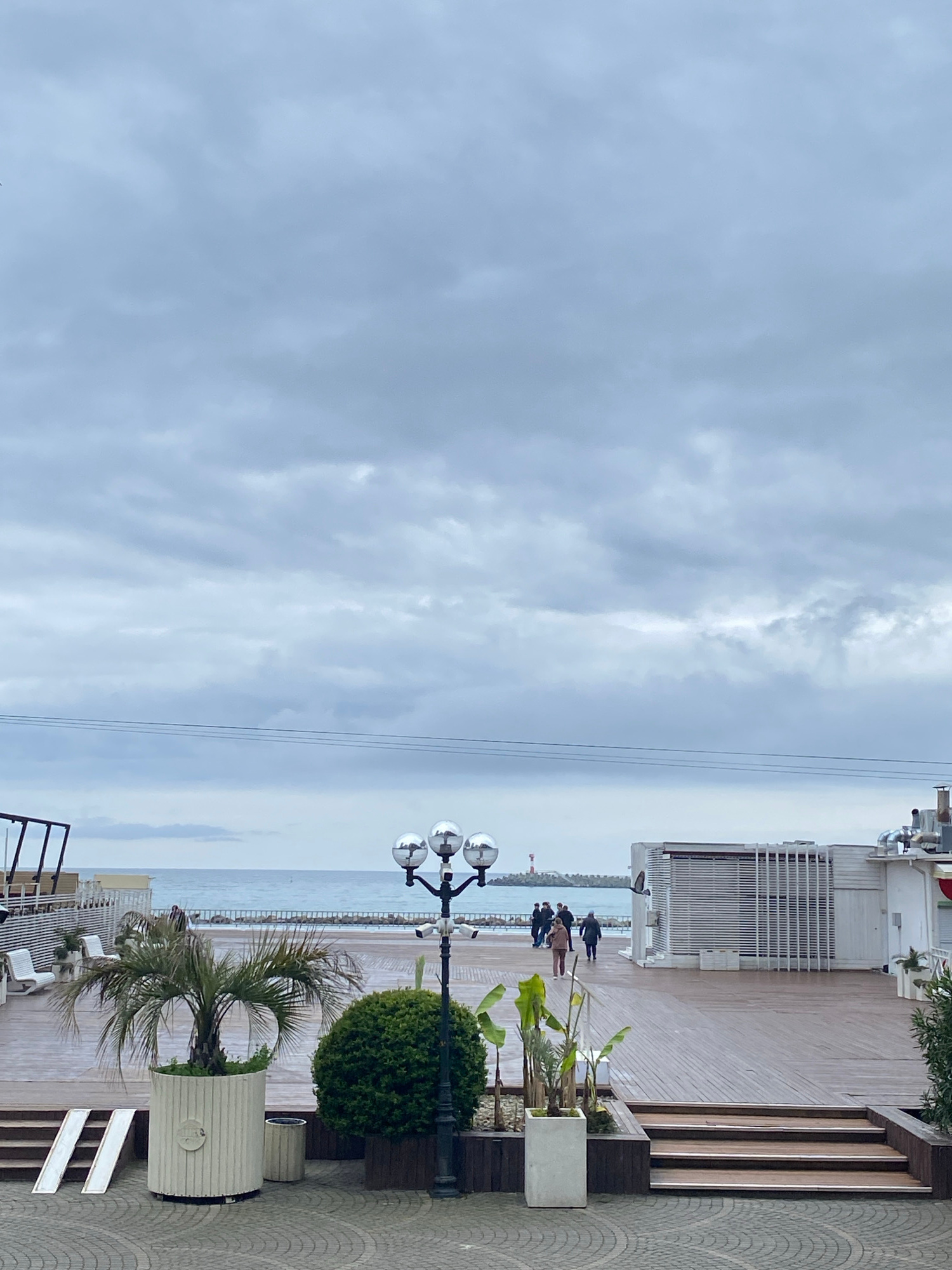 The image depicts a boardwalk in Sochi, Russia, under a cloudy sky. Several people are walking along the boardwalk near a breakwater. A distinctive lamp post with four globe lights and several large p…read more