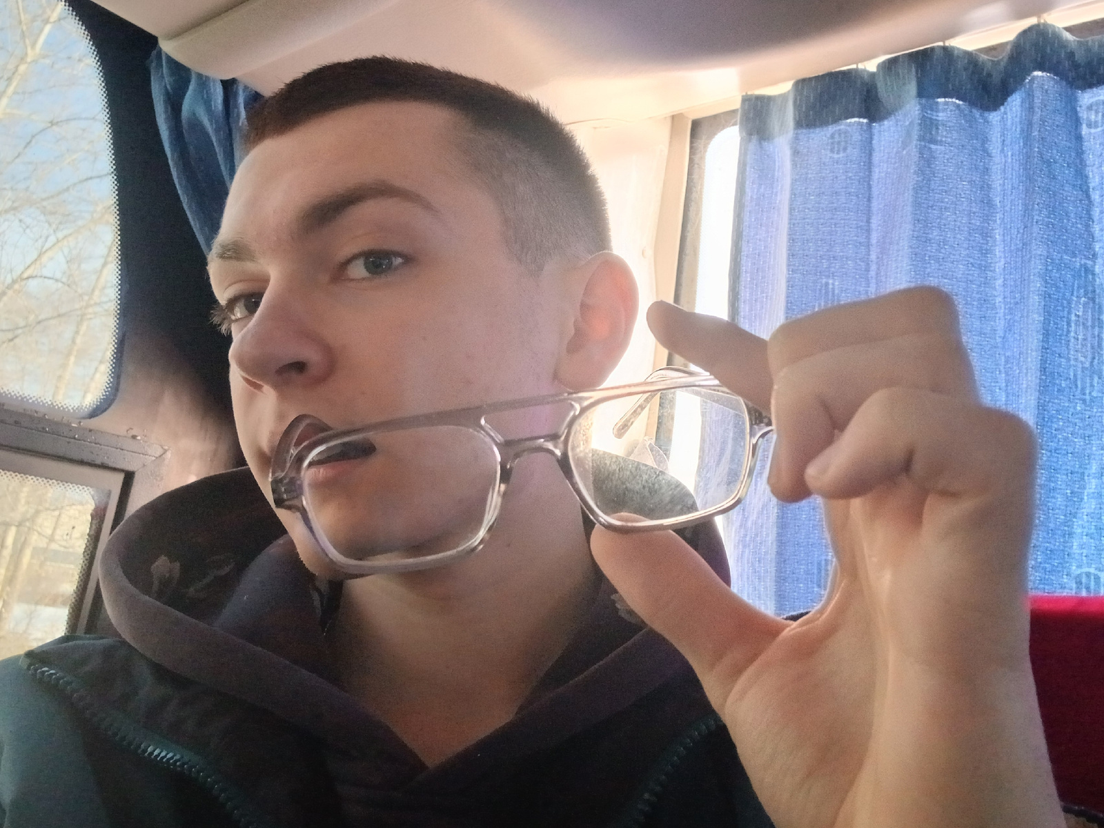 A fair-skinned young man with short, dark hair is inside what appears to be a bus. He is holding a pair of glasses in his right hand and part of the frame is in his mouth. He's wearing a dark-colored…read more